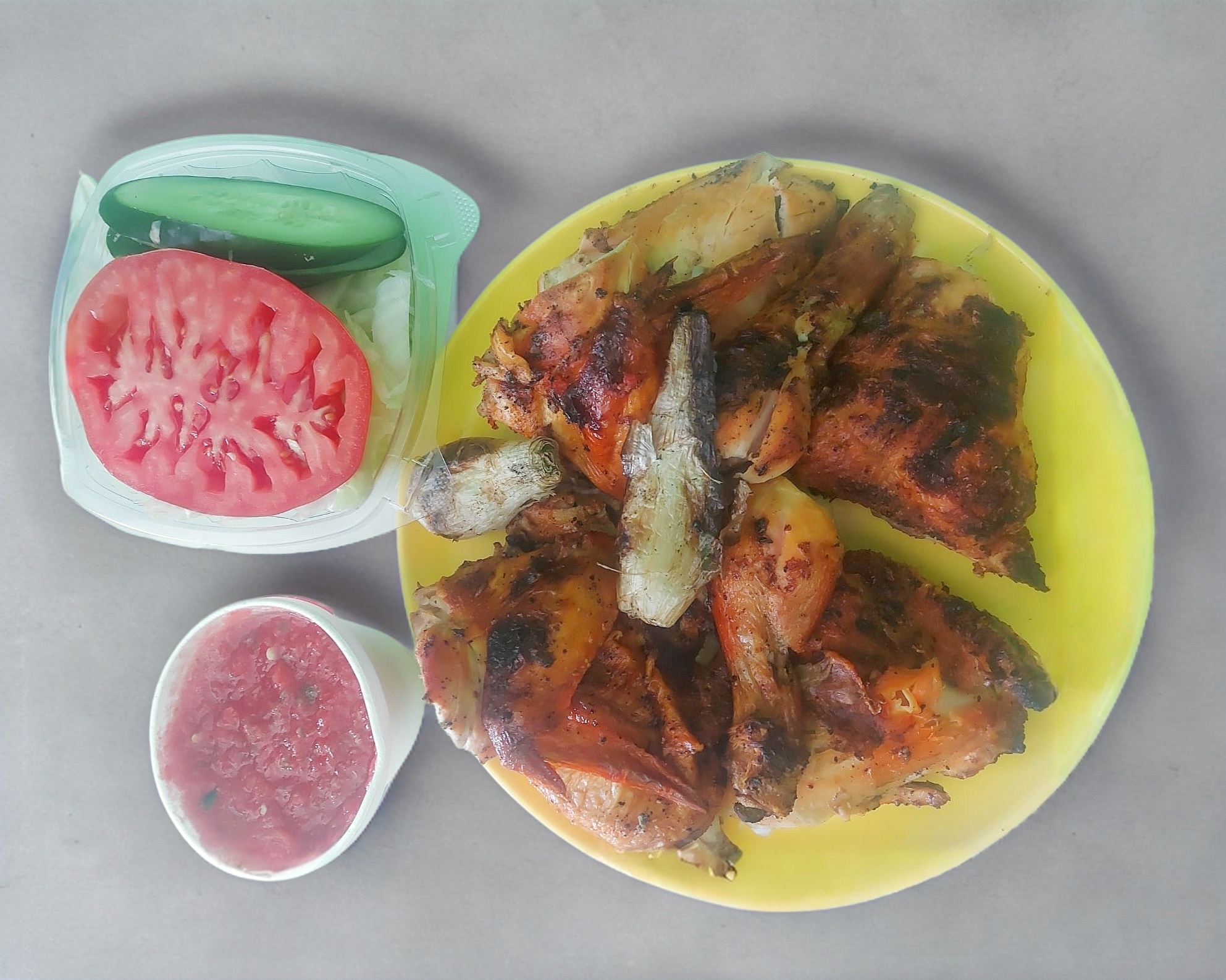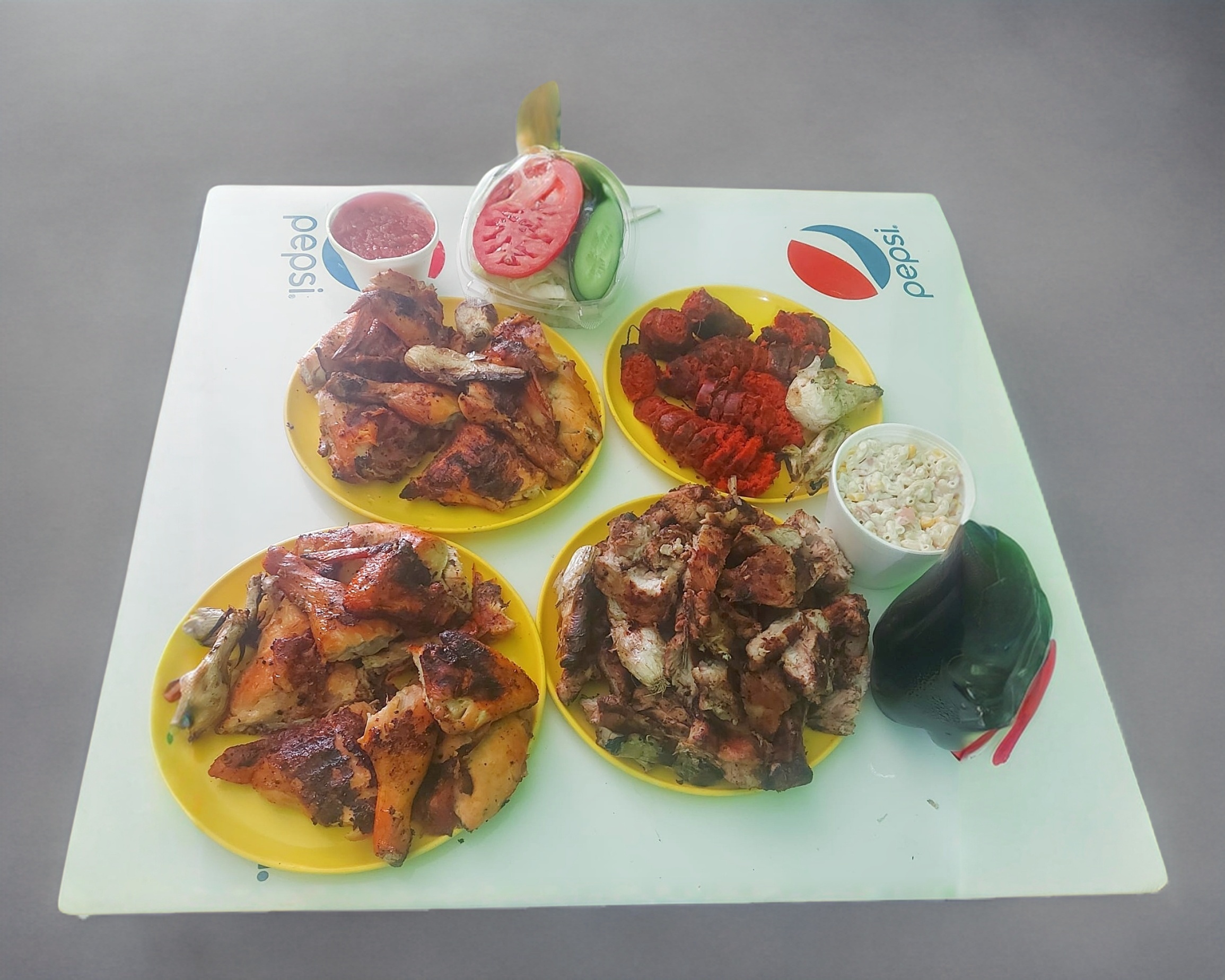 2 Pollos, 1 costilla, 2 tortillas, 1/2 chorizo, 2 sopas, 1 r. 3 litros, salsa, ensalada, chiles y cebollas.