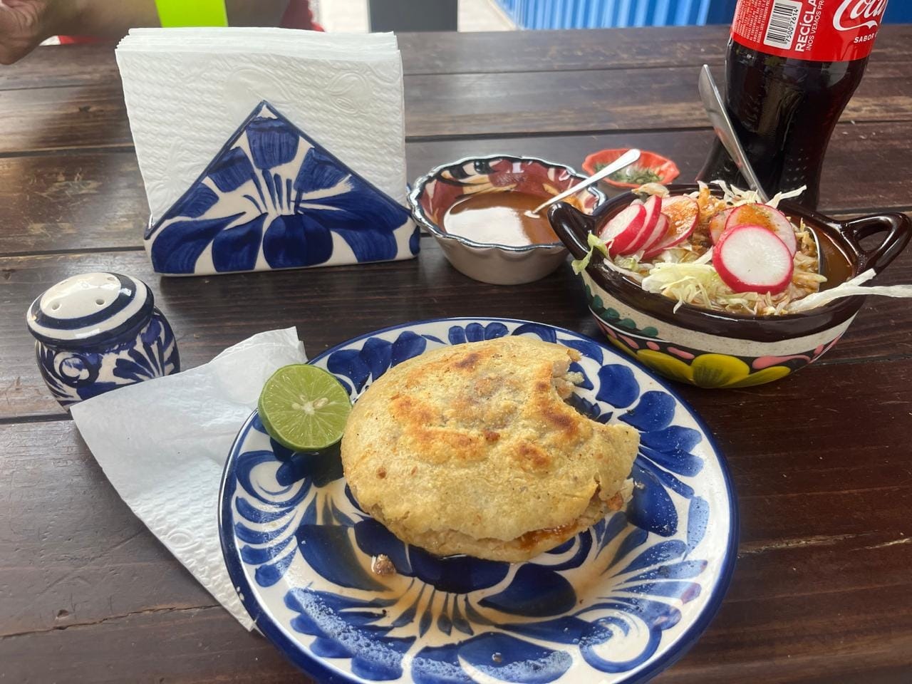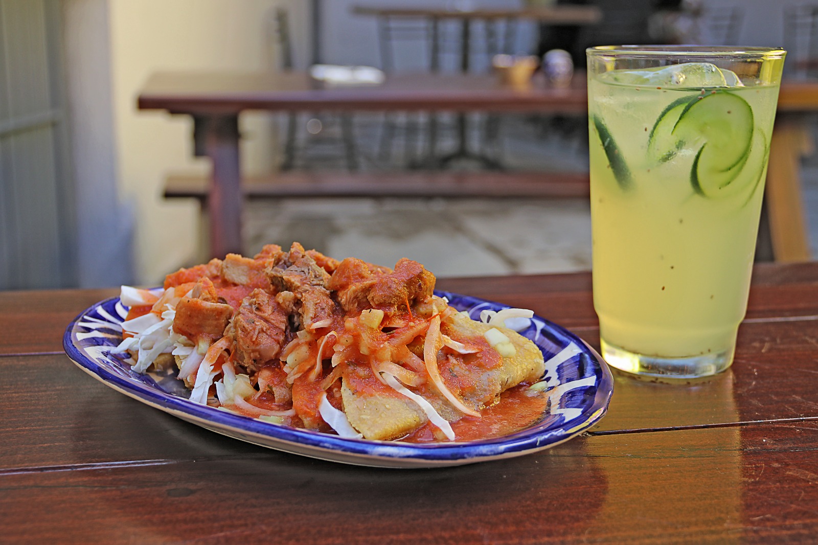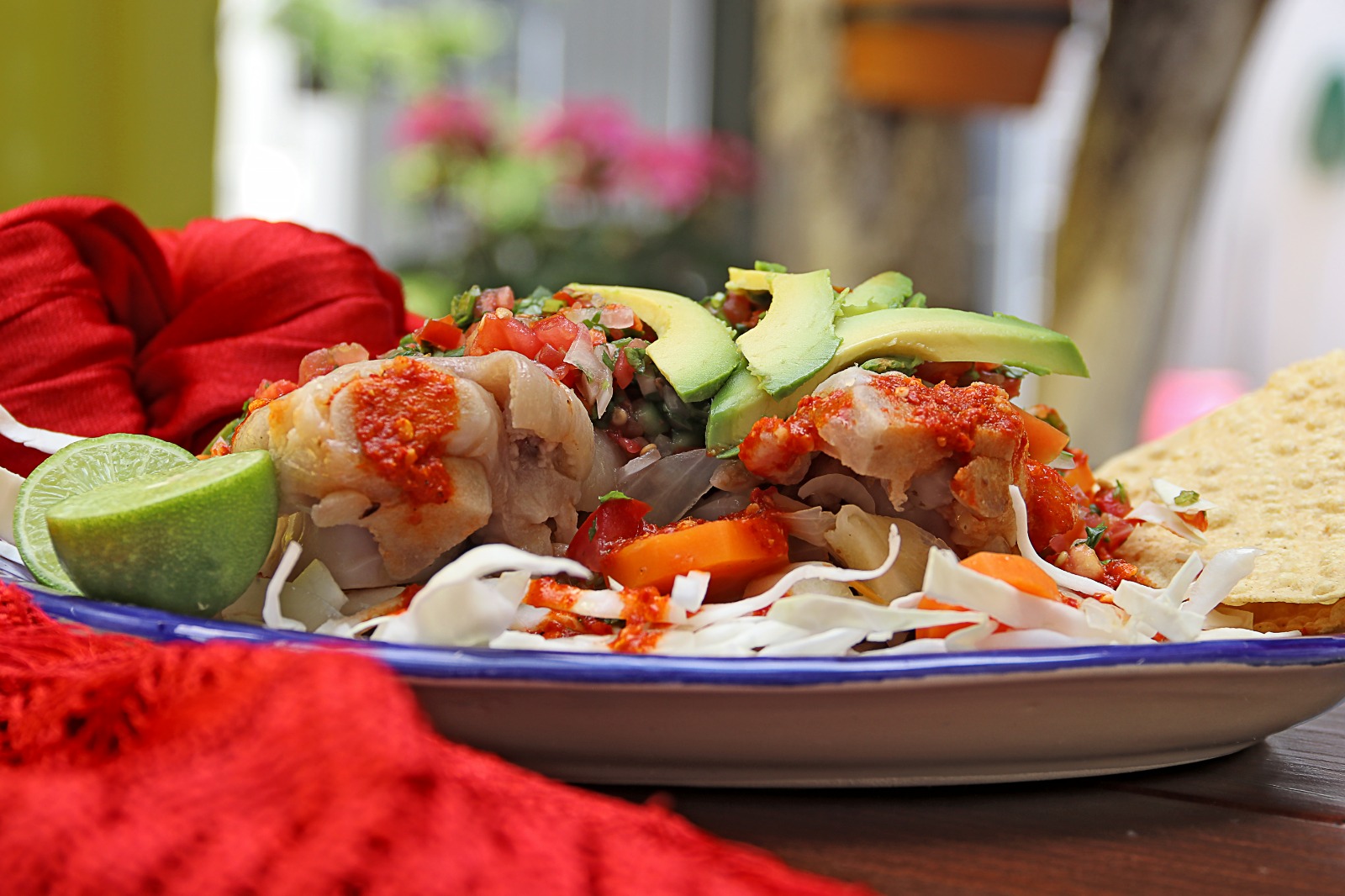 Servidas en una cama de repollo, acompañadas de pico de gallo, aguacate, salsita de árbol y tostadas.