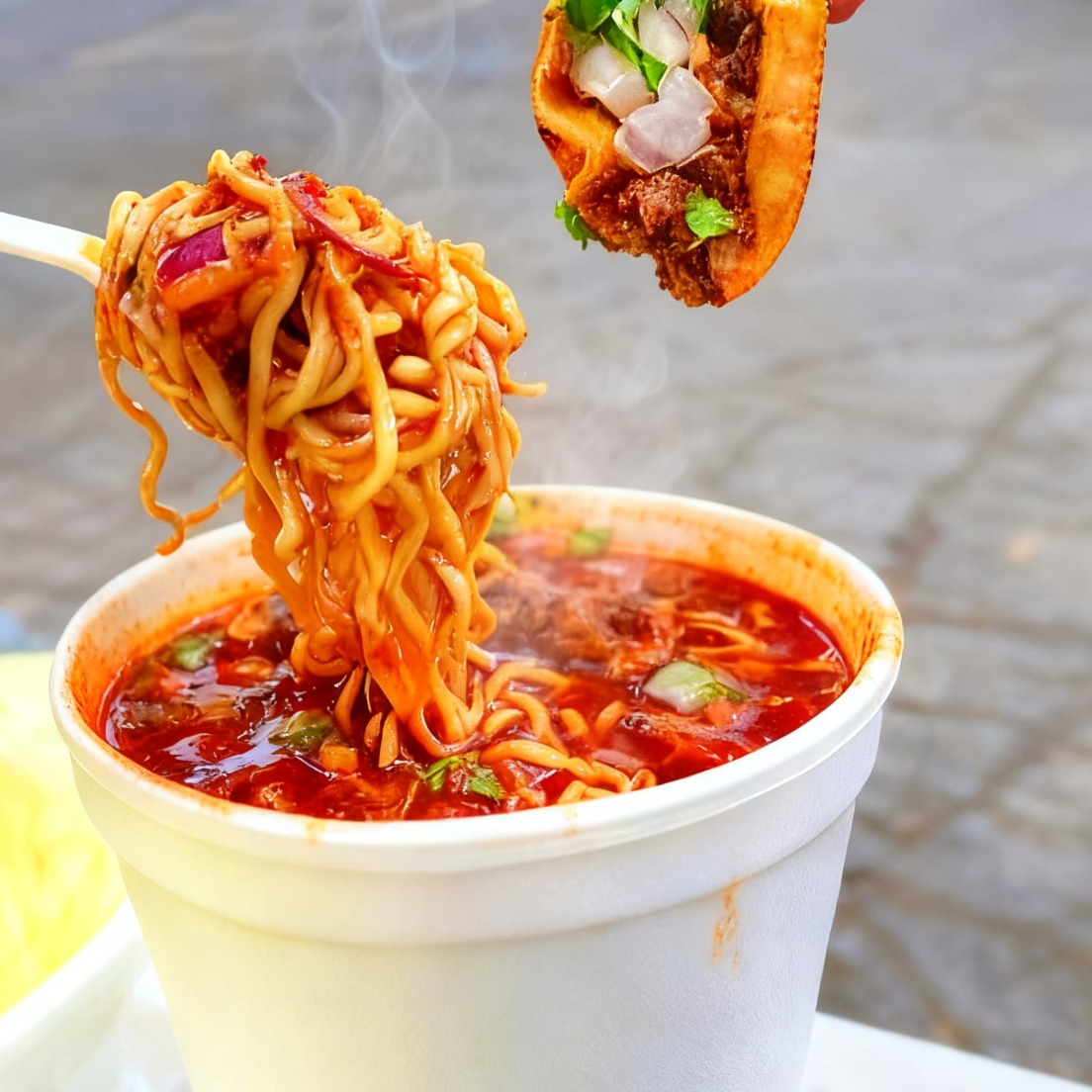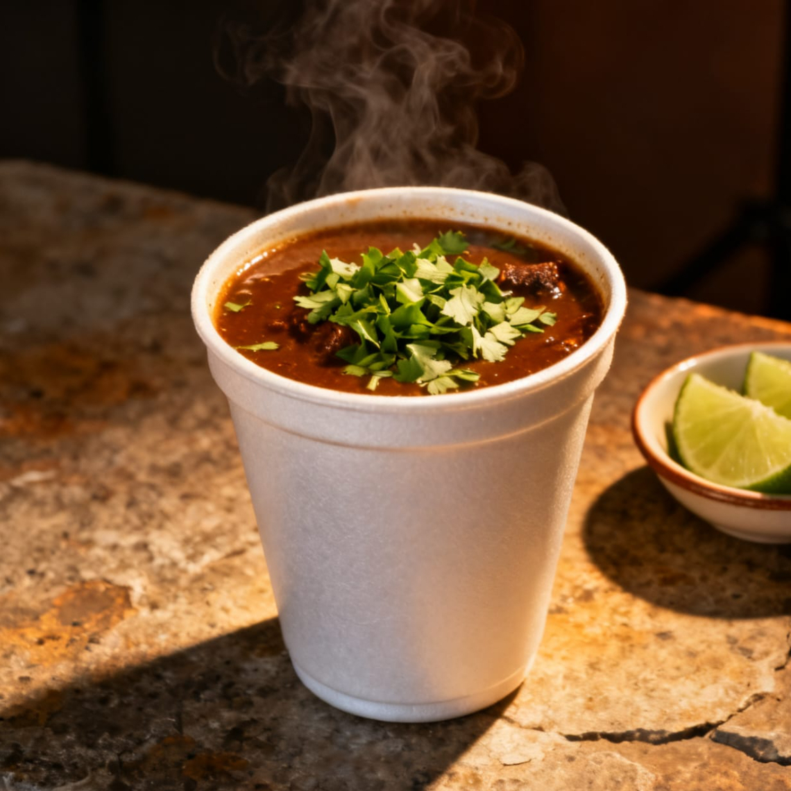 sopa instantánea en un vaso de unicel mediano con caldo y carne de birria de res incluye cilantro cebolla y salsa