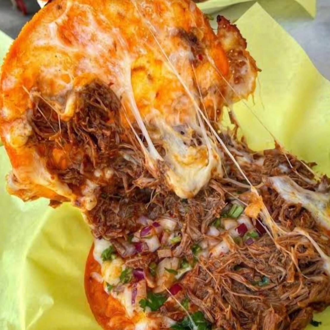 rica birria con queso asadero en medio de dos tortillas incluye cilantro, cebolla y salsa