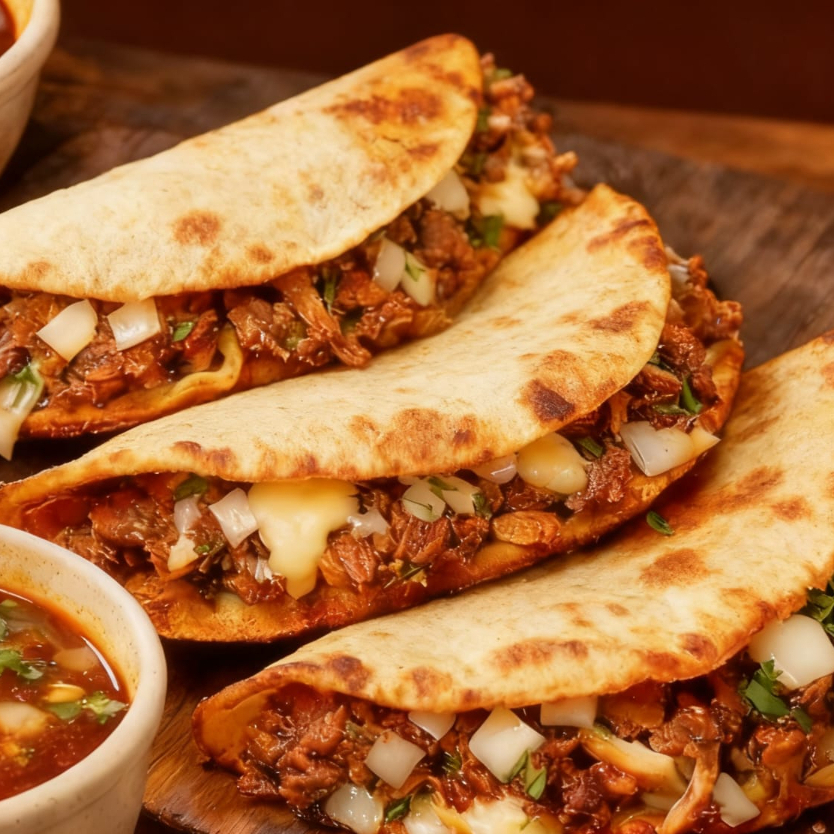 rica quesadilla de birria de res con tortilla de maíz con queso, cilantro, cebolla y salsas