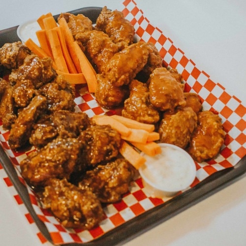 25 Piezas de alitas, bañadas en la salsa de tu elección, acompañadas de zanahoria y 1oz de aderezo ranch.