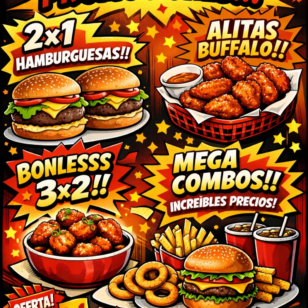 Hamburguesa, mas 3 alitas, papota, bebida, escoge 1 salsa para tus alitas, el plato son con pequeñas porciones.