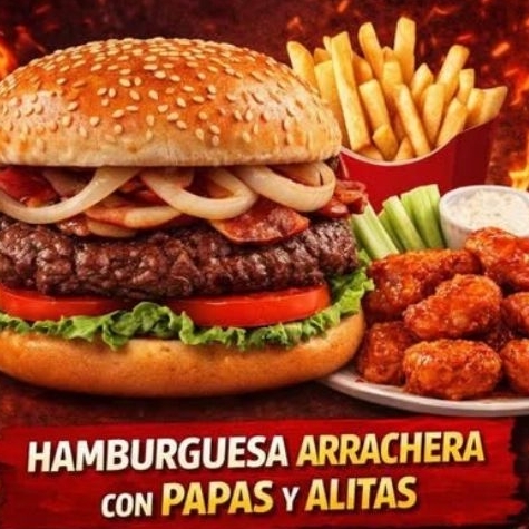 Hamburguesa Arrachera*1 + PAPAS FRANCESA*1 + ALITAS X PIEZA*3