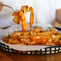 Papas a la francesa, queso amarillo, tocino y cebollín.