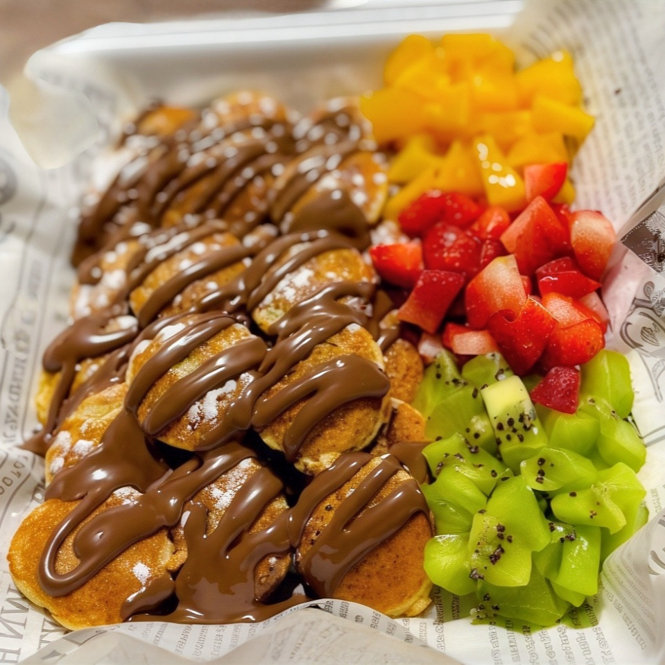 Orden de mini hot cakes con fresa, kiwi, durazno y nutella