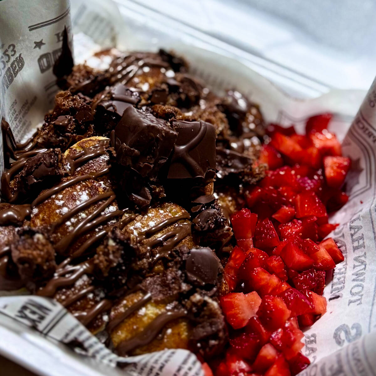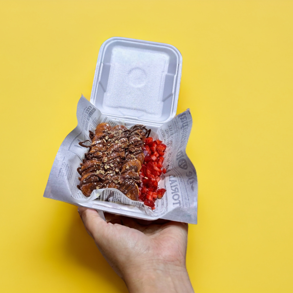 Orden de mini hotcakes con fresa, nutella, chocolate y kinder delice