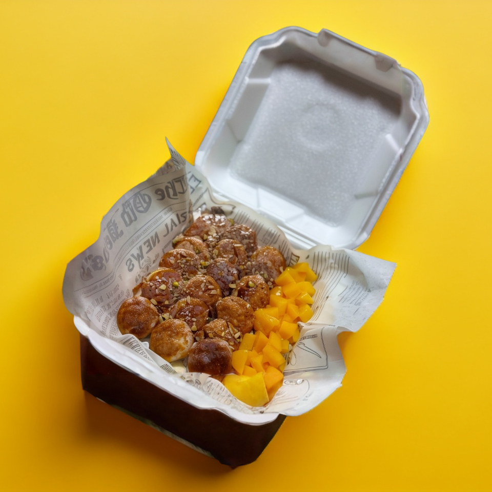 Orden de mini hotcakes con durazno, nuez y lechera