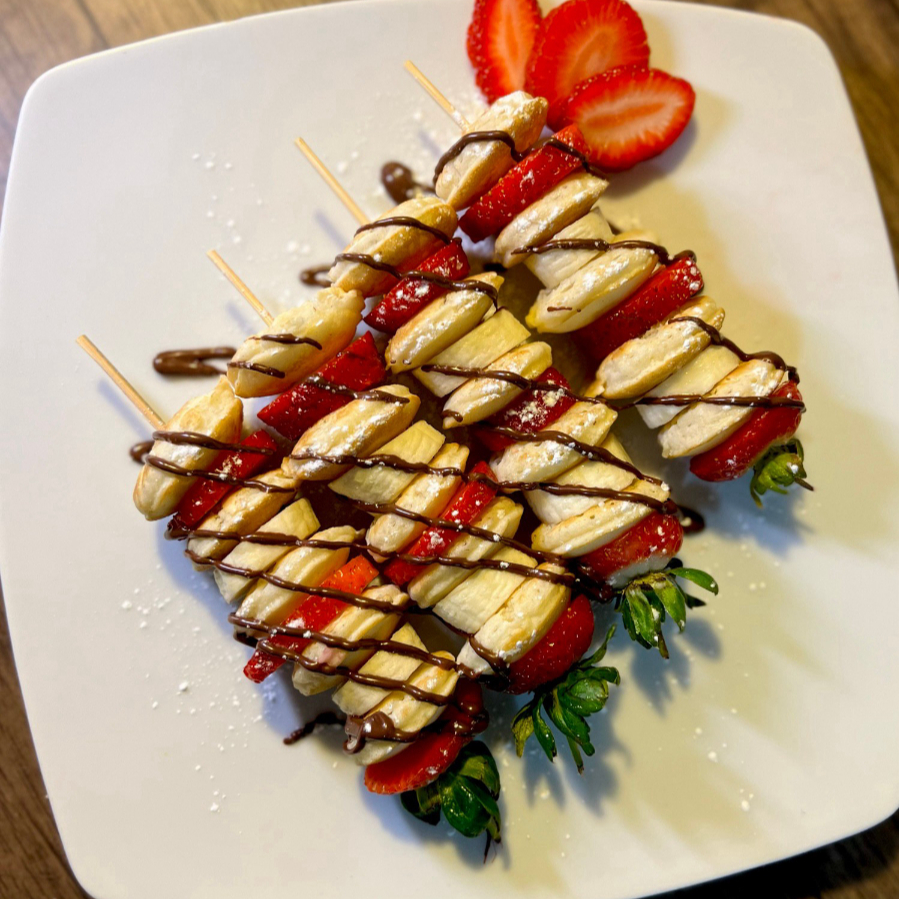 4 brochetas de mini hot cakes con fresa, plátano y nutella