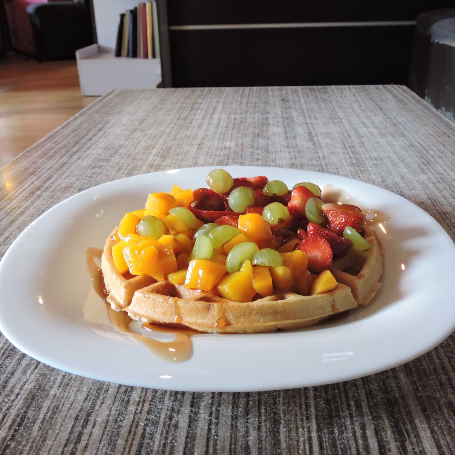 Waffle de Plátano, Fresa, Durazno, Uva y Cereza