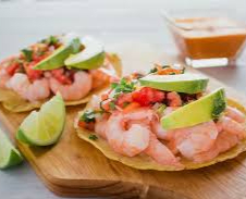 Tostada fresca con camarones jugosos, aguacate y limón.