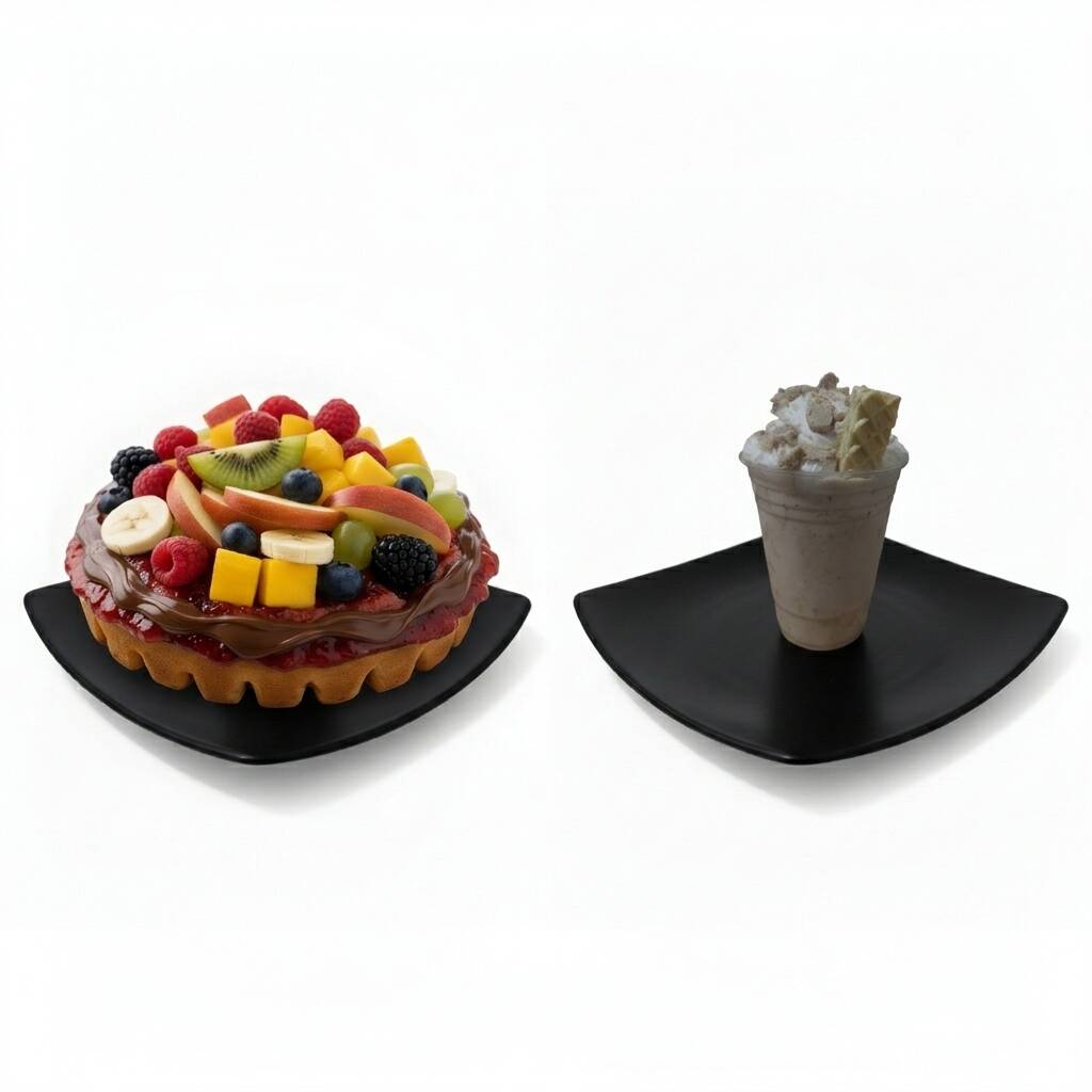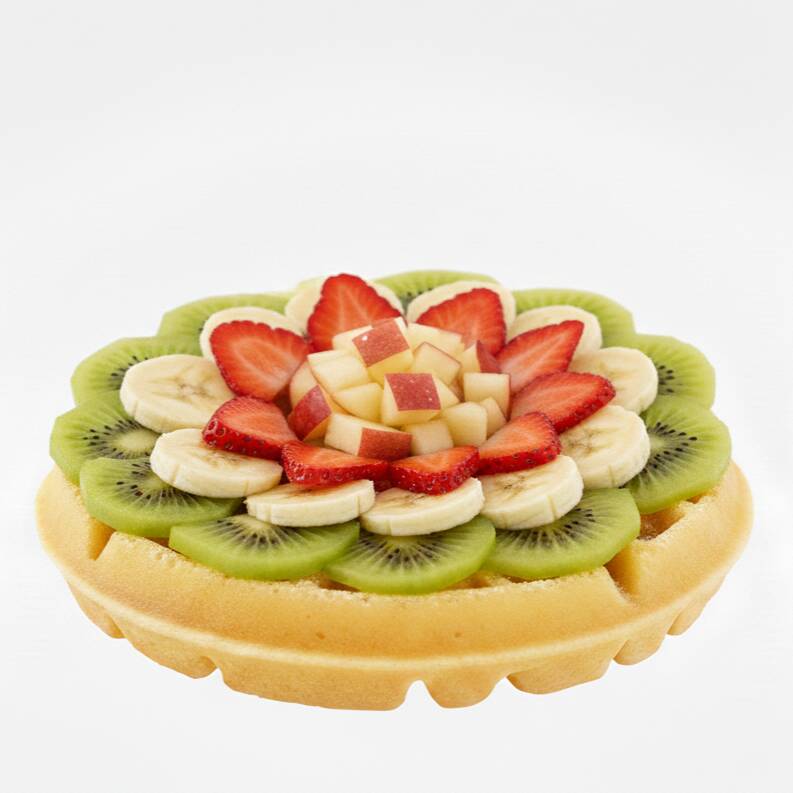 Pan de Vainilla, acompañado de; platano, manzana, kiwi, mango, frambuesa, zarzamora, uvas verdes, coctel de frutas y fresa.