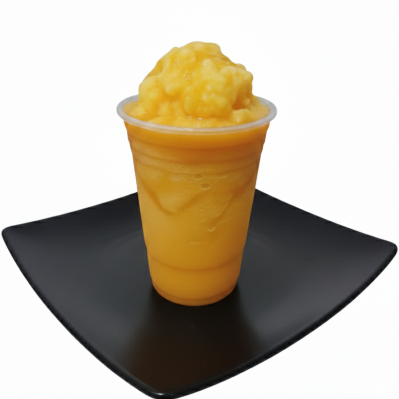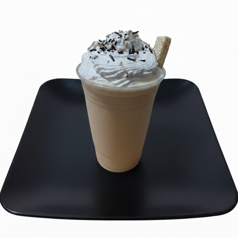 Smoothie sabor mango en leche, acompañado; crema batida, una galleta cremax de vainilla, lluvia de café.
