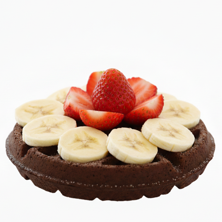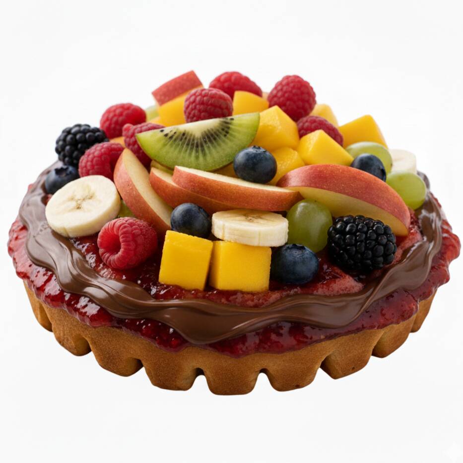 Pan de chocolate base de nutella con chispas de chocolate, acompañado; plátano, fresa, manzana, mango, jarabe de chocolate.