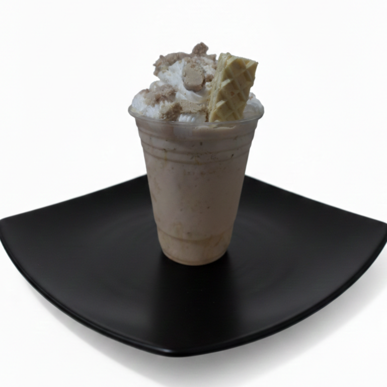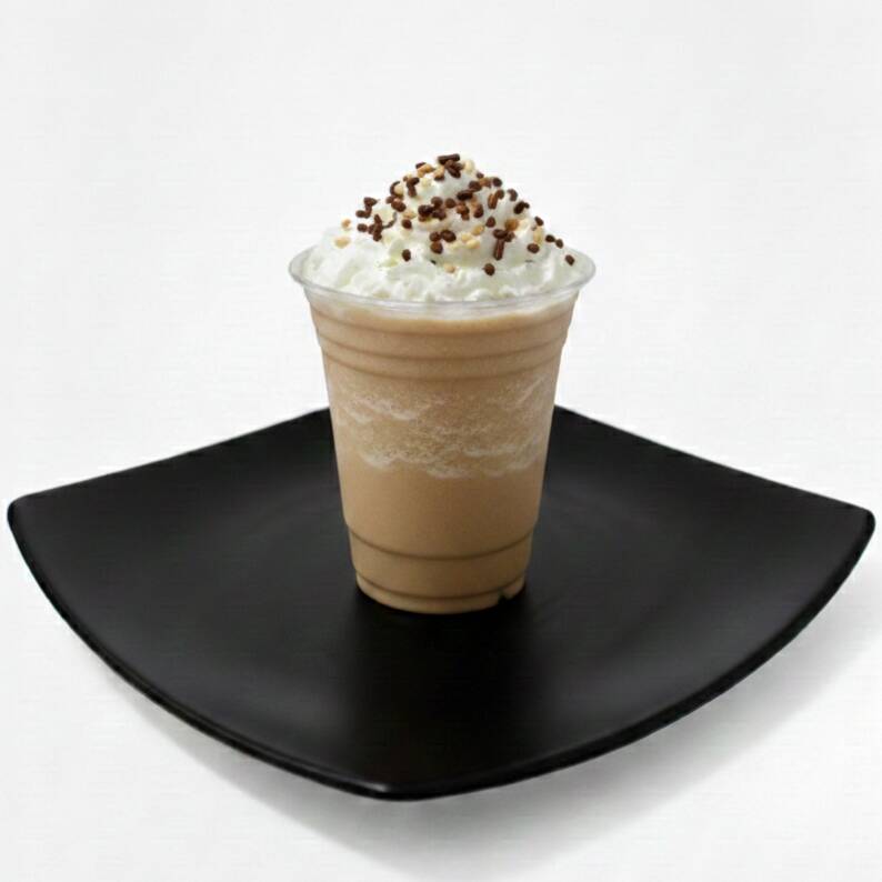 Bebida fría a base de un Café espumoso y delicioso, acompañado; 2 galletas suavicremas de vainilla, mazapán triturado y crema batida.
