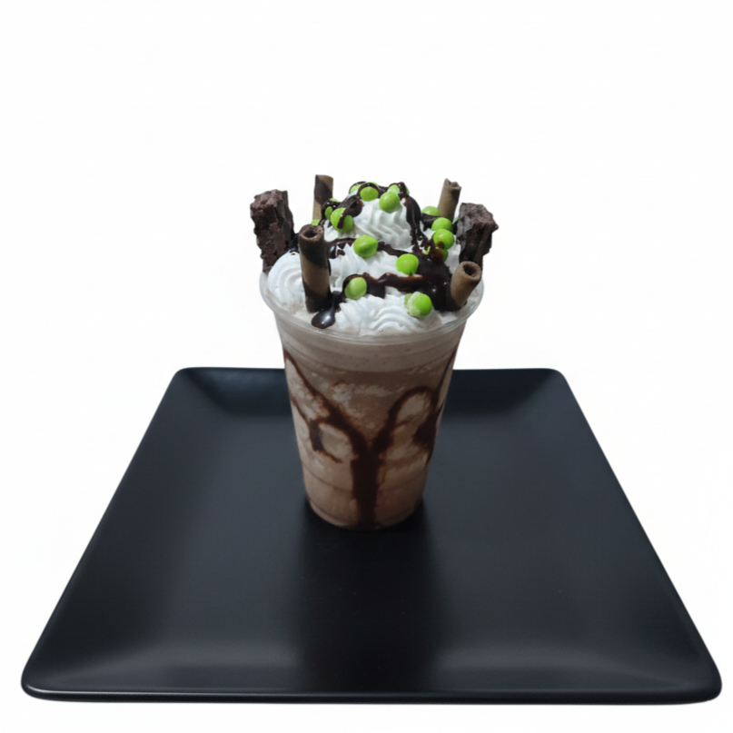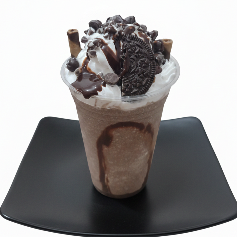 Bebida fría a base de oreo con jarabe de chocolate Hershey, acompañados de snacks; galleta oreo, popote chocolate y chispas de chocolate, lleva incluida crema batida.