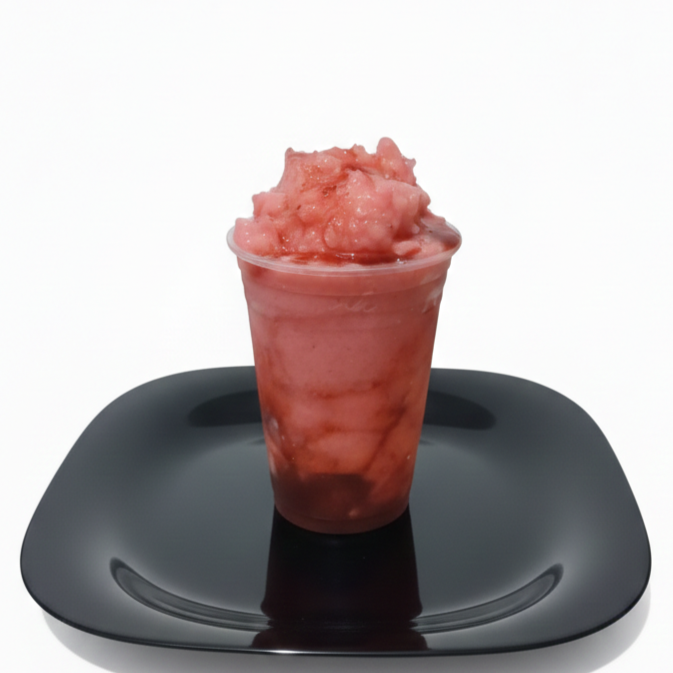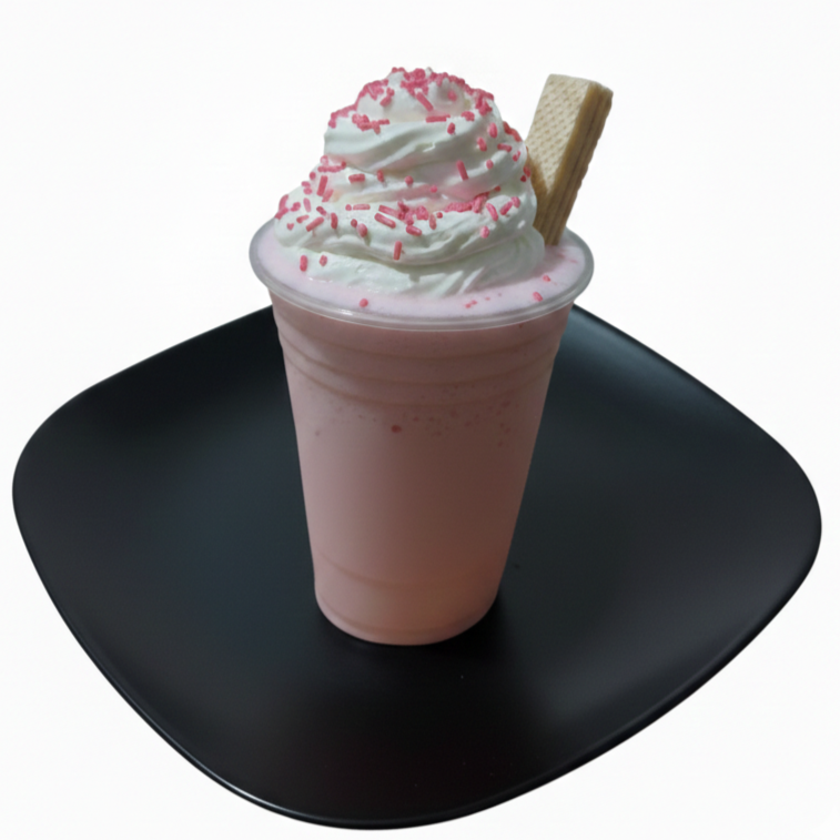 Smoothie cremoso de fresa c/ jarabe de fresa, acompañado; crema batida, popote de sabor a fresa, una galleta cremax de fresa con chispas sabor a fresa y con jarabe de fresa en la cima.