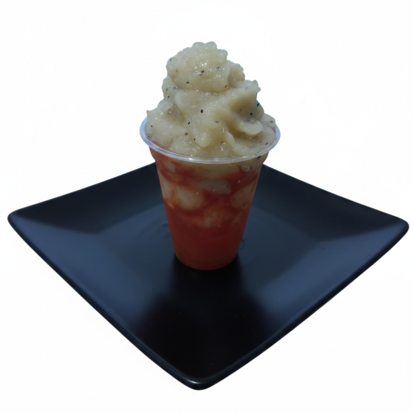Bebida fría a base de Mazapán c/ crema de maní, acompañados de snacks; 3 galletas cremax vainilla, 4 popote chocolate, Mazapán triturado, un dulce de chocolate relleno de cacahuate, lleva incluida crema batida. (En este caso, algunos toppings se mandaran en una bolsa aparte por el bien de la bebida).