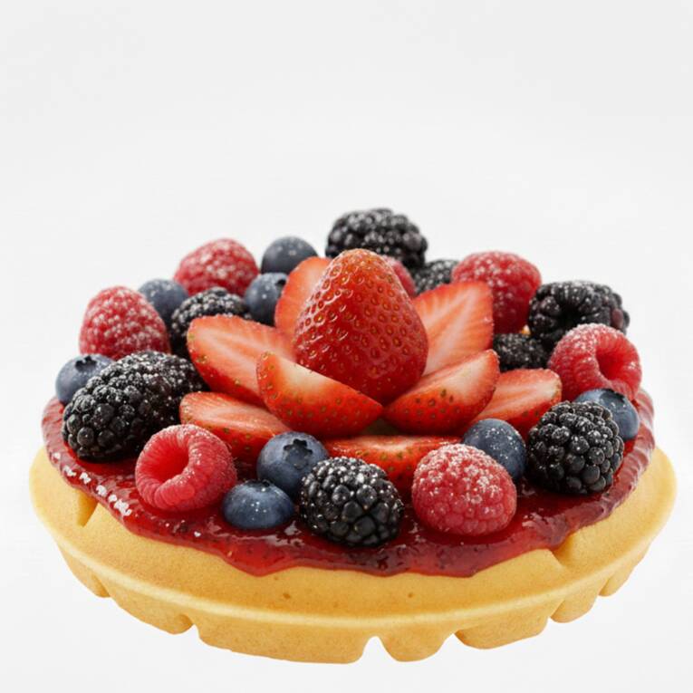 Pan de Vainilla con base de jaleas; fresa, frutos rojos, zarzaramora, acompañados; fresa, mora azul, frambuesa, zarzamora.