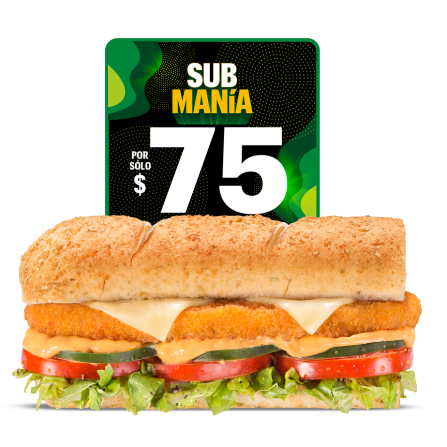 Pan integral con tiras de pechuga de pollo estilo teriyaki, doble porción de queso americano, cebollitas crujientes, lechuga, jitomates, pimientos verdes y aderezo de cebolla dulce, más papas o galleta y bebida.