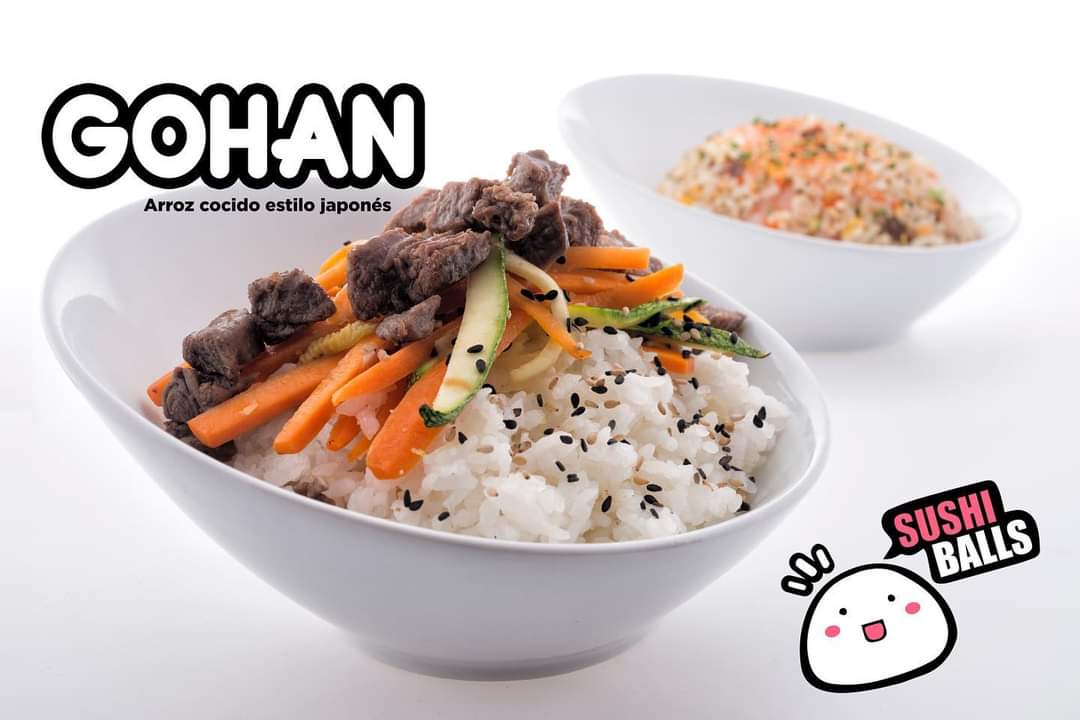 Gohan arrachera, preparado con arrachera y aguacate, arroz cocido estilo japonés.