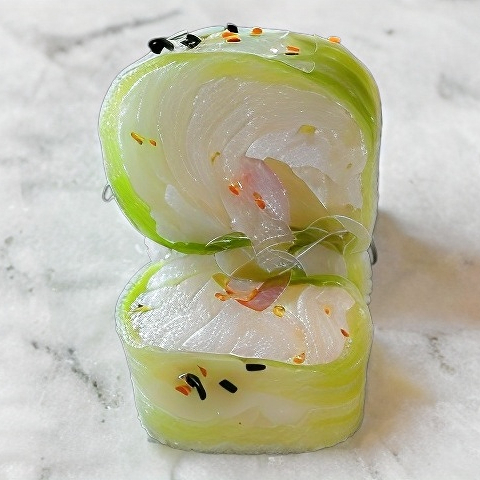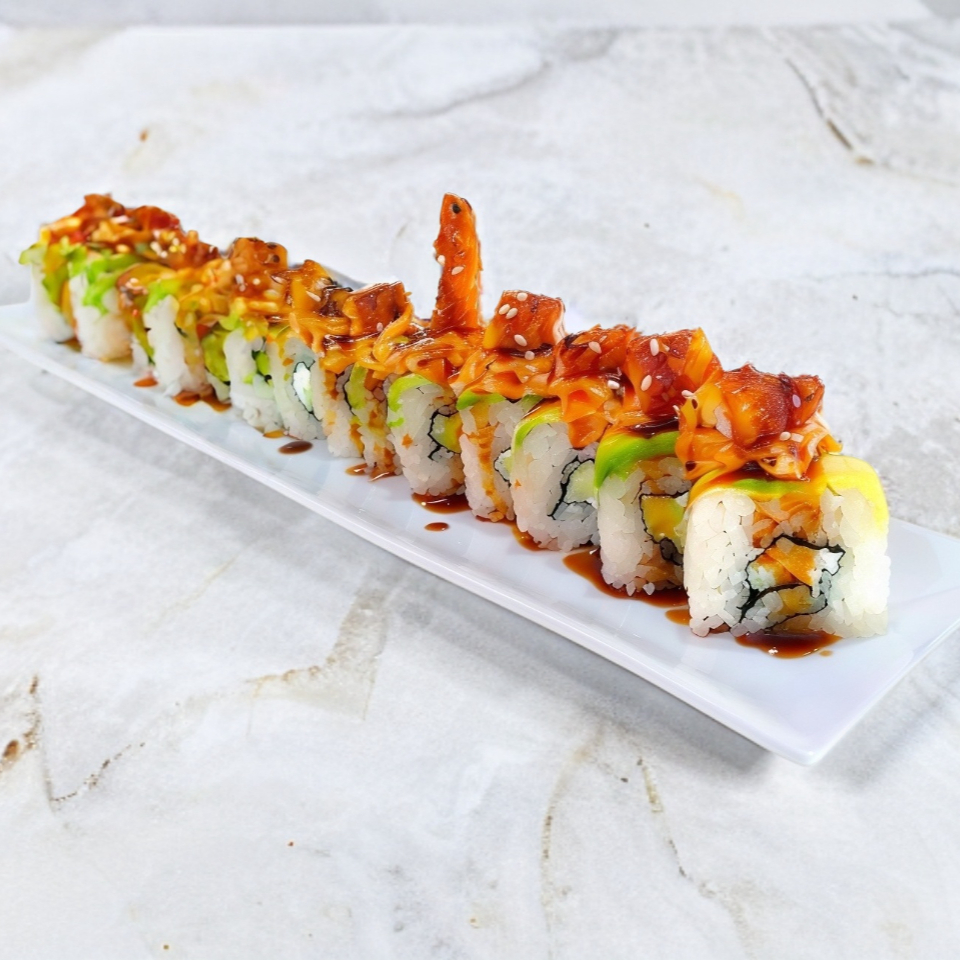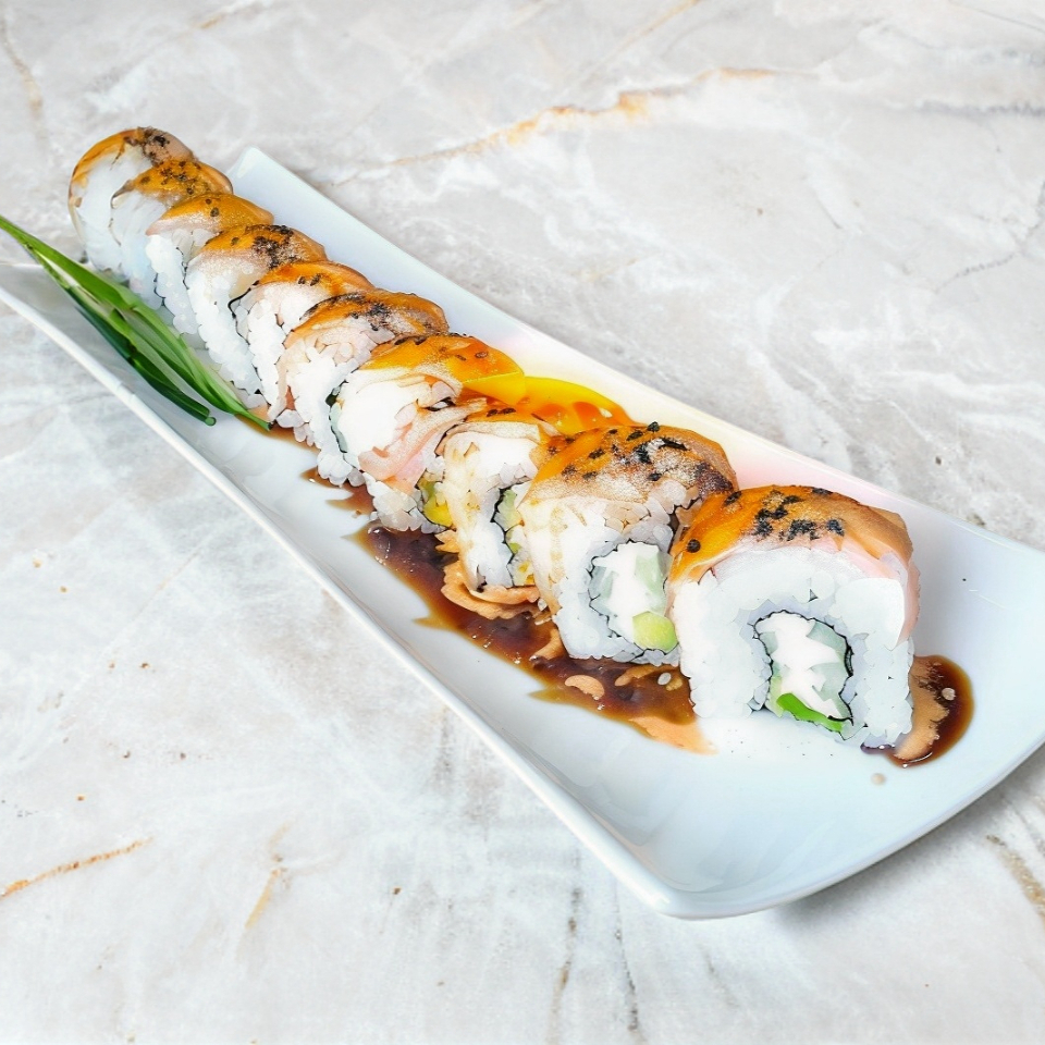 Cubierto de aguacate, encima camarón empanizado, spicy bañado en salsa dulce.Relleno de pepino y queso