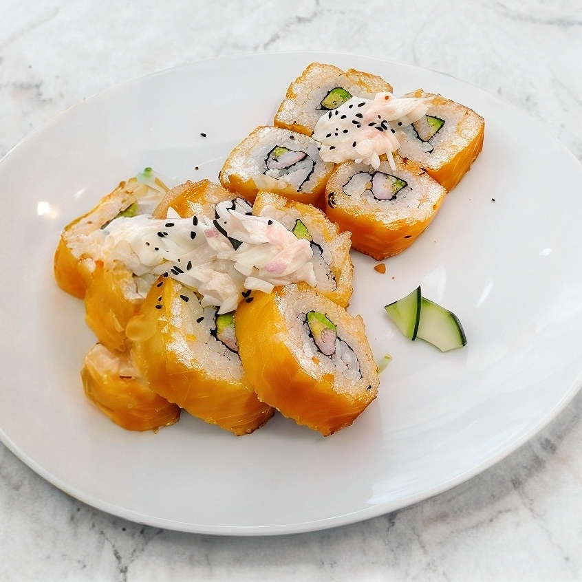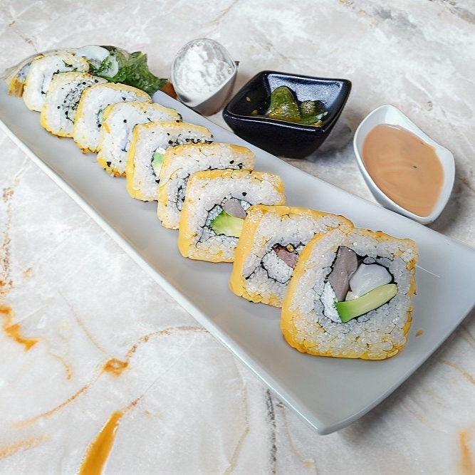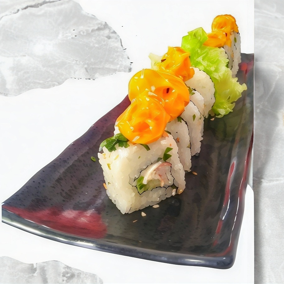Platillo personal 10 bocados Cubiertos de aguacate, encima camarón empanizado, spicy bañado en salsa dulce. Relleno de pepino y queso.