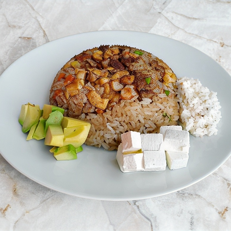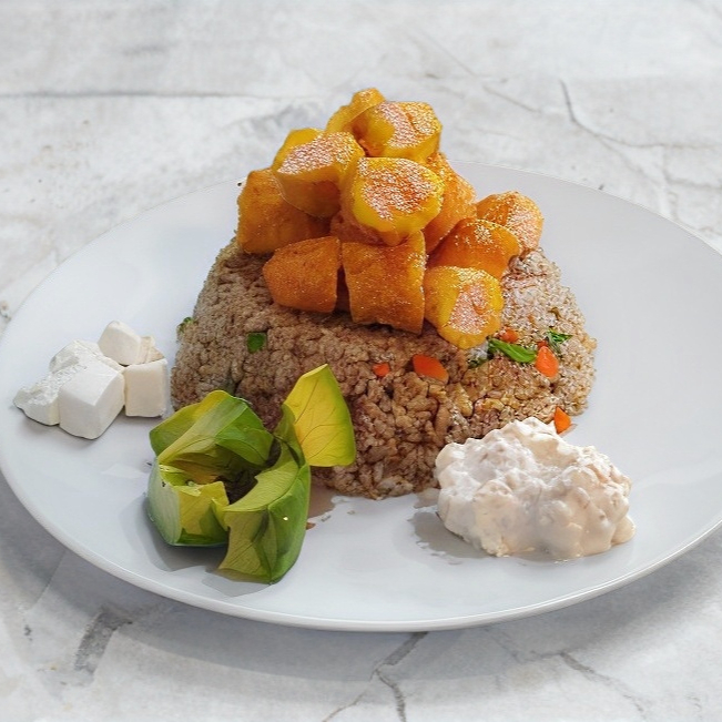 Arroz frito acompañado de verduras a la plancha pollo, res, camarón, aguacate, queso y tampico