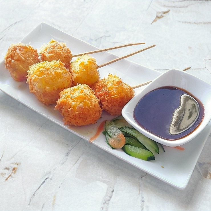 Bola de arroz empanizada, bañada en chipotle tampico y salsa de anguila. Rellena de aguacate, queso camarón, cangrejo o