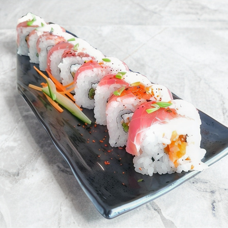 Cubierto en Atún fresco bañado en aderezo acevichado un toque de togarashi y cebollín. Relleno de camarón empanizado y aguacate