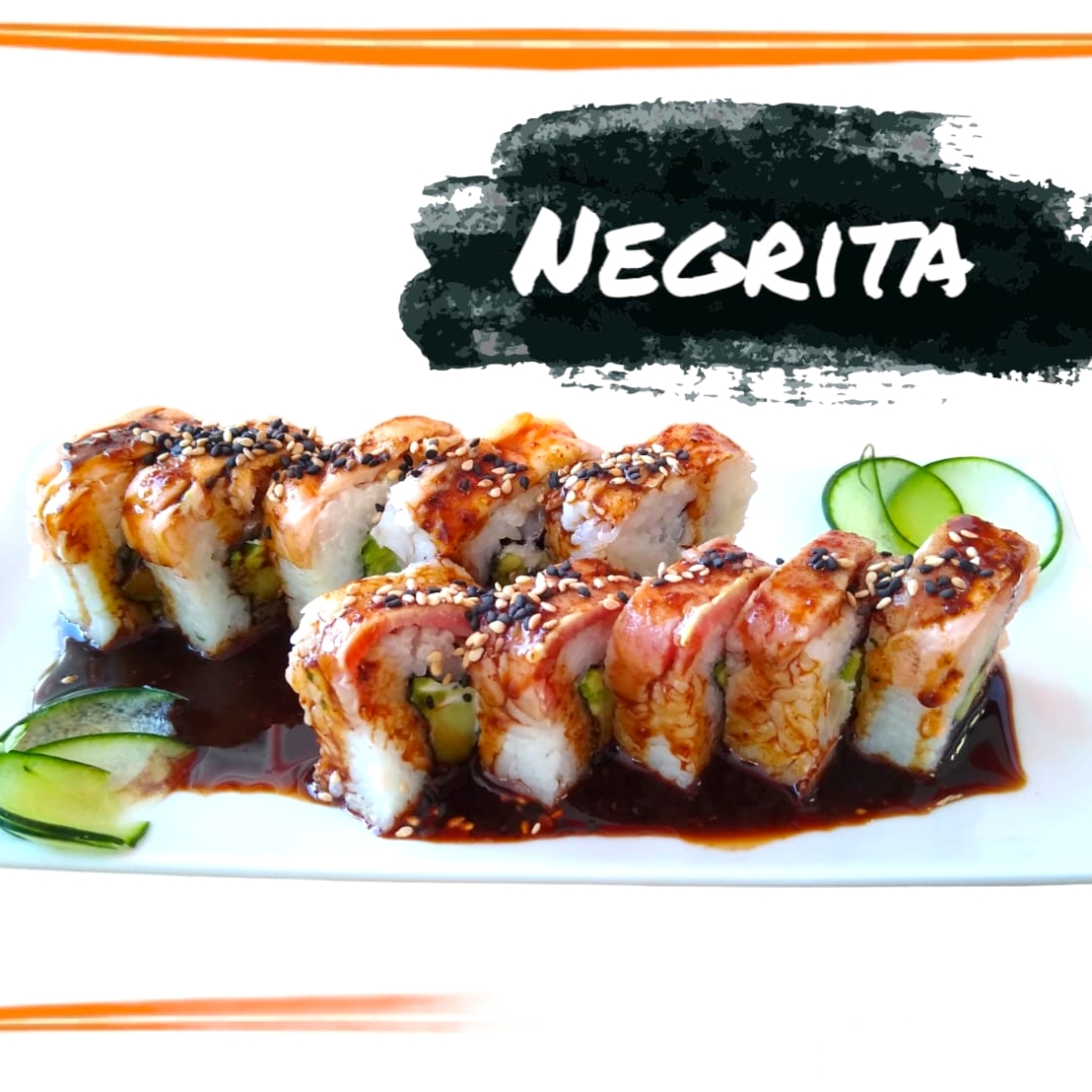 Envuelto en camarón bañado en salsa chipotle y anguila flameado Relleno de aguacate y pepino