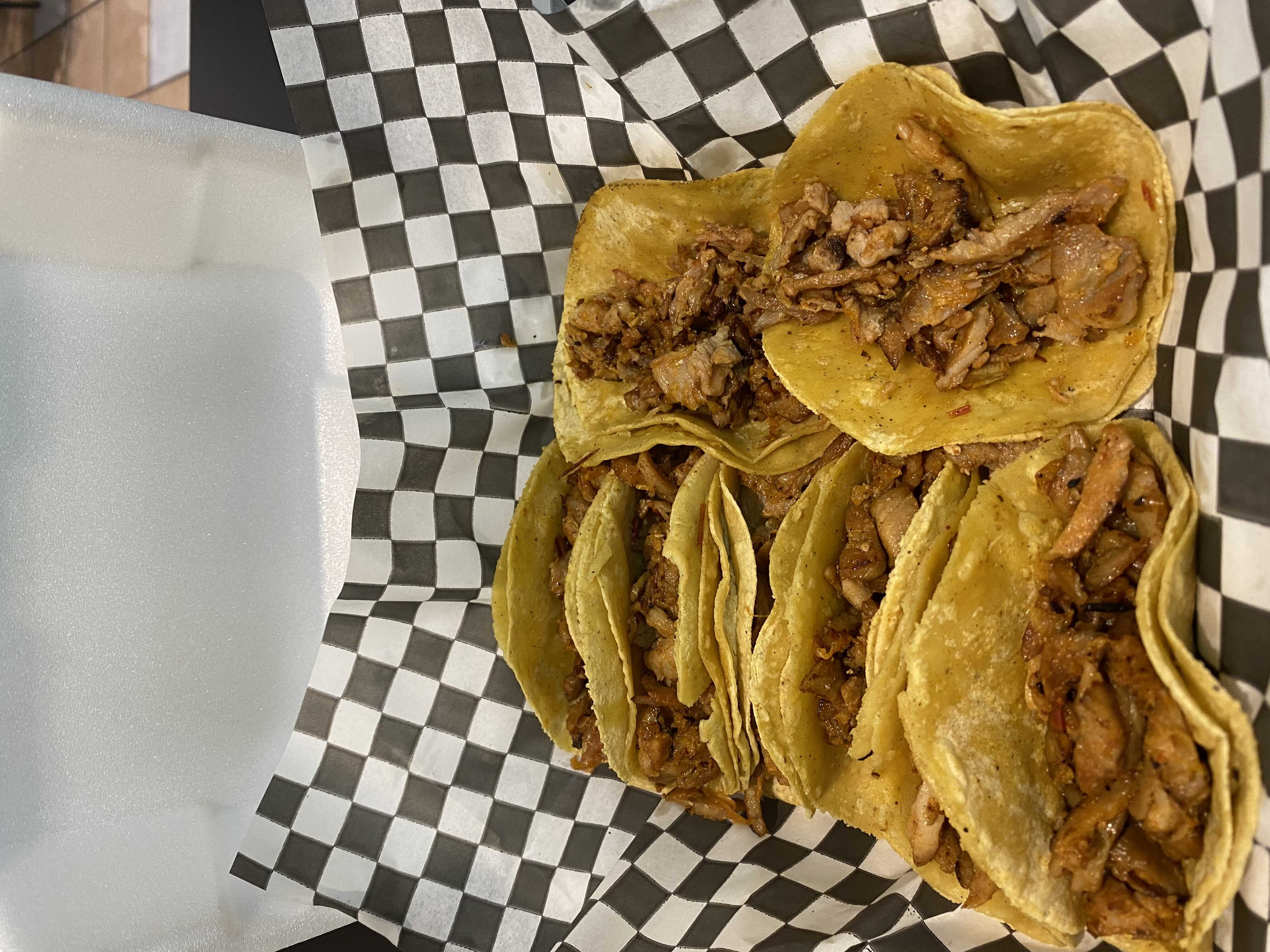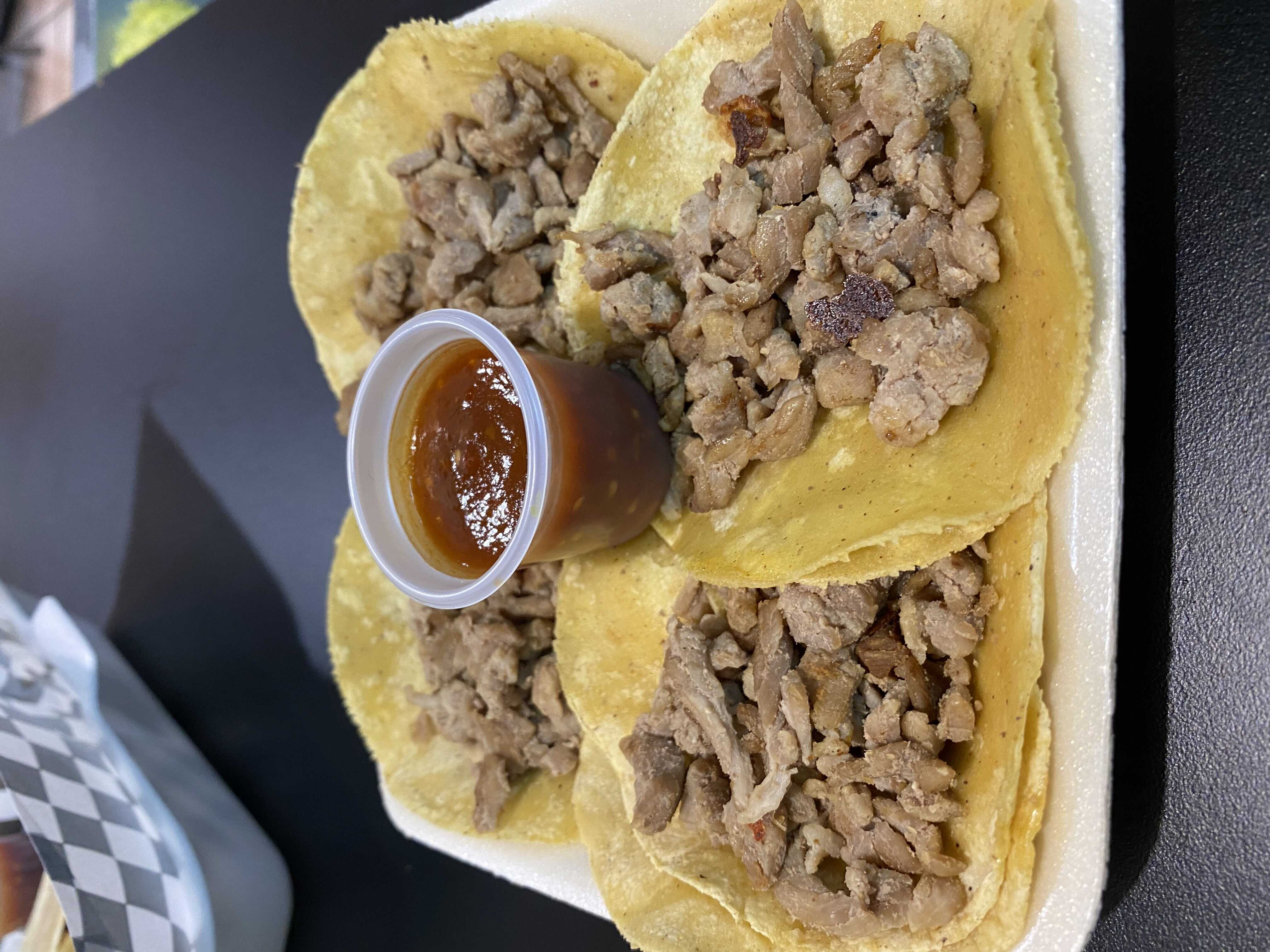 Doble tortilla taquera con carne al pastor de cerdo preparado sin verdura tal cual como se muestra en la imagen