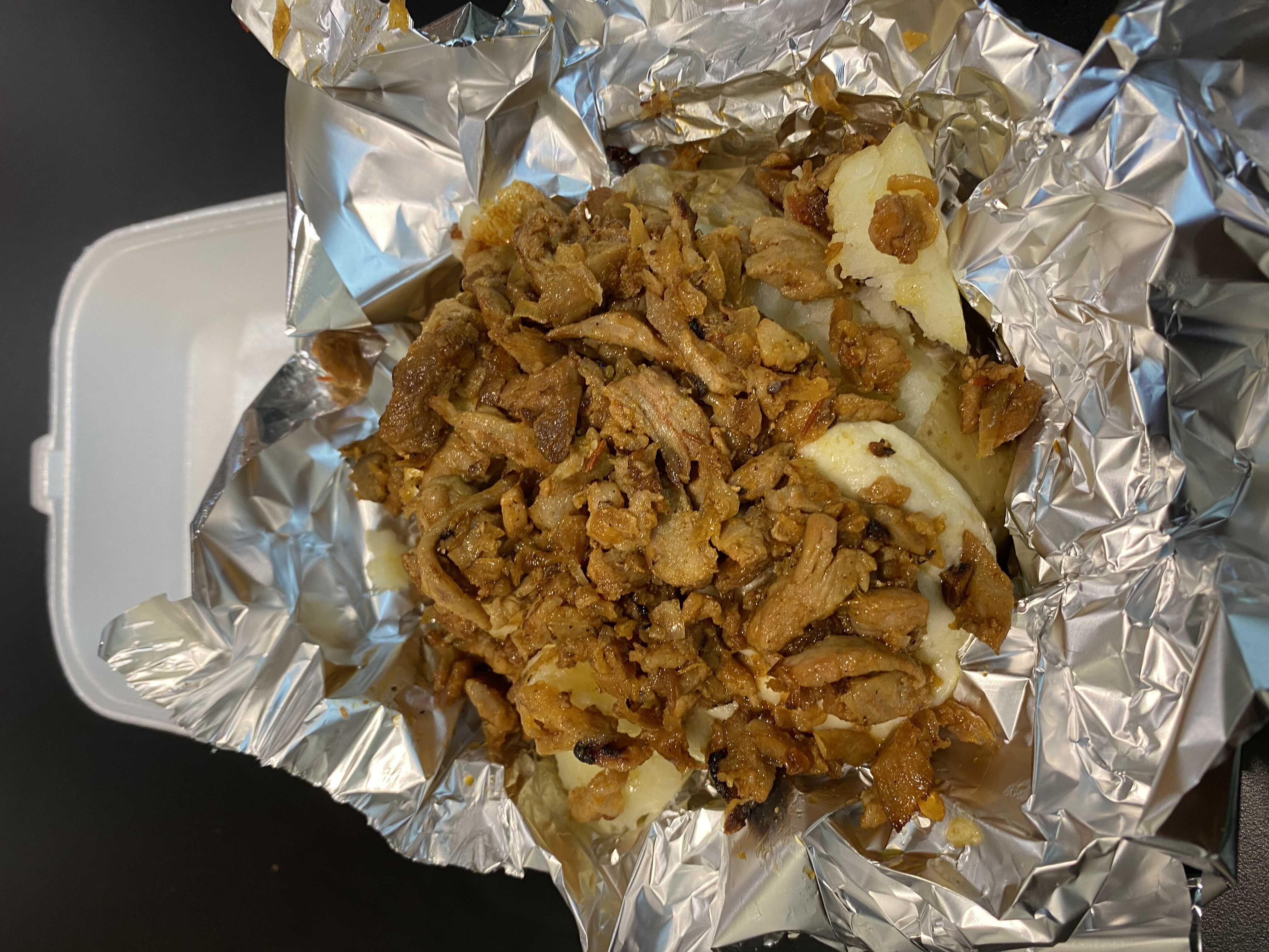130 gr de papa natural con poca mantequilla, queso asadero y carne al pastor preparada sin verdura