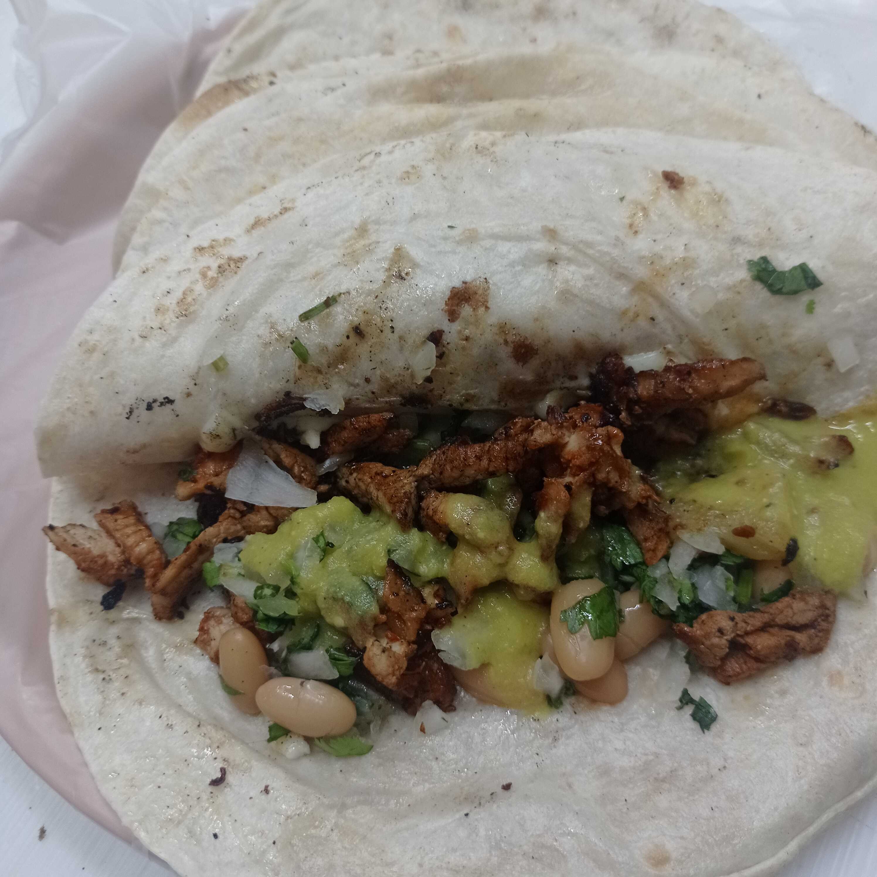 Tortilla grande de harina, arroz, frijoles, queso asadero , chorizo y aguacate