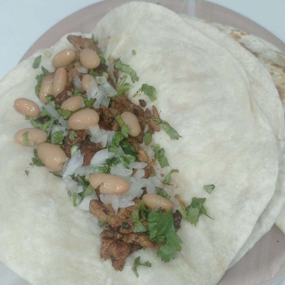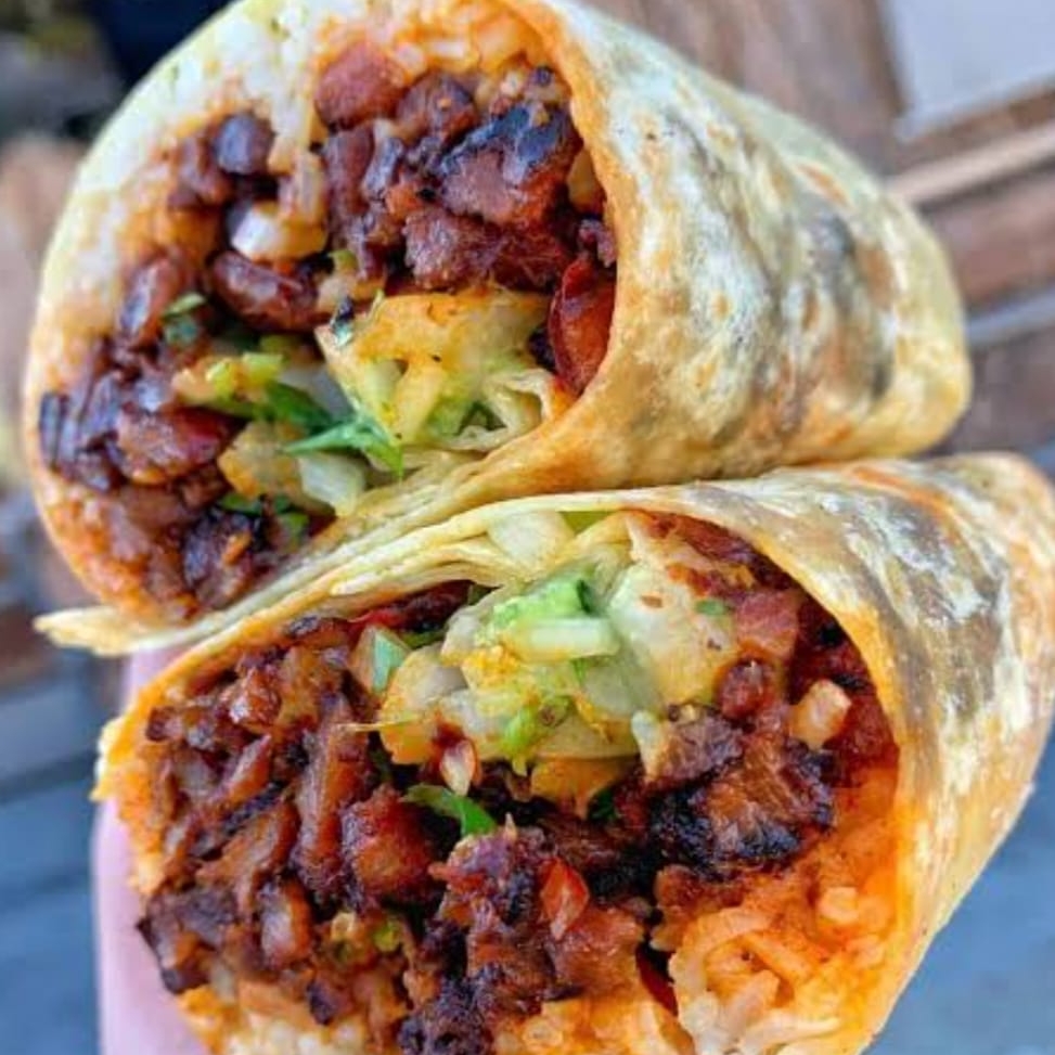 Tortilla grande de harina, arroz, frijoles, queso asadero, pastor y aguacate, salsa roja