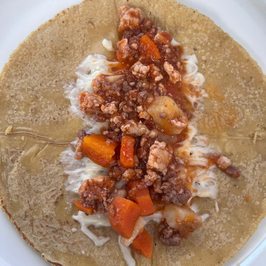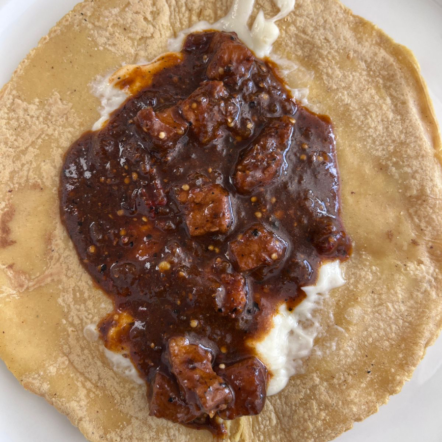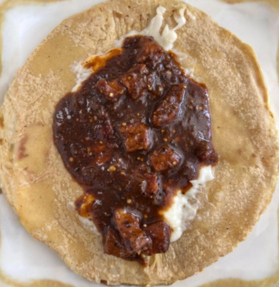 QUESADILLA CARNE DE PUERCO CHILE PASILLA Y FRIJOLE