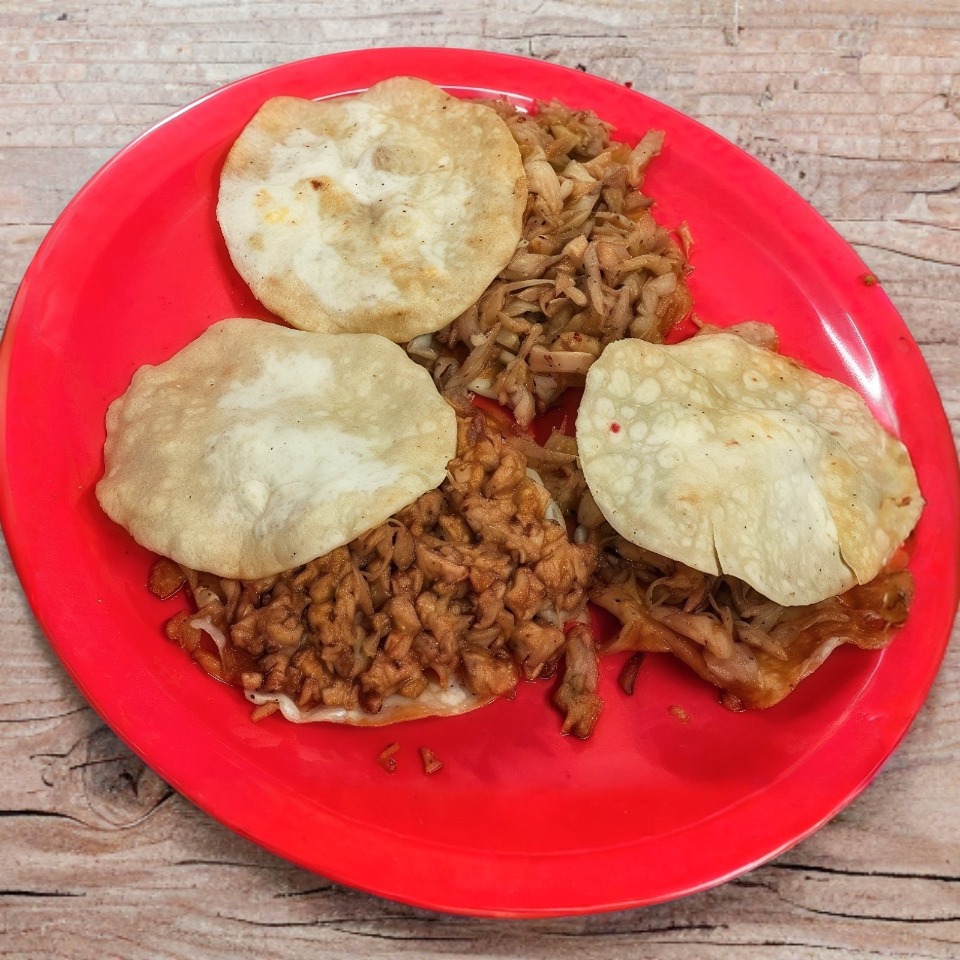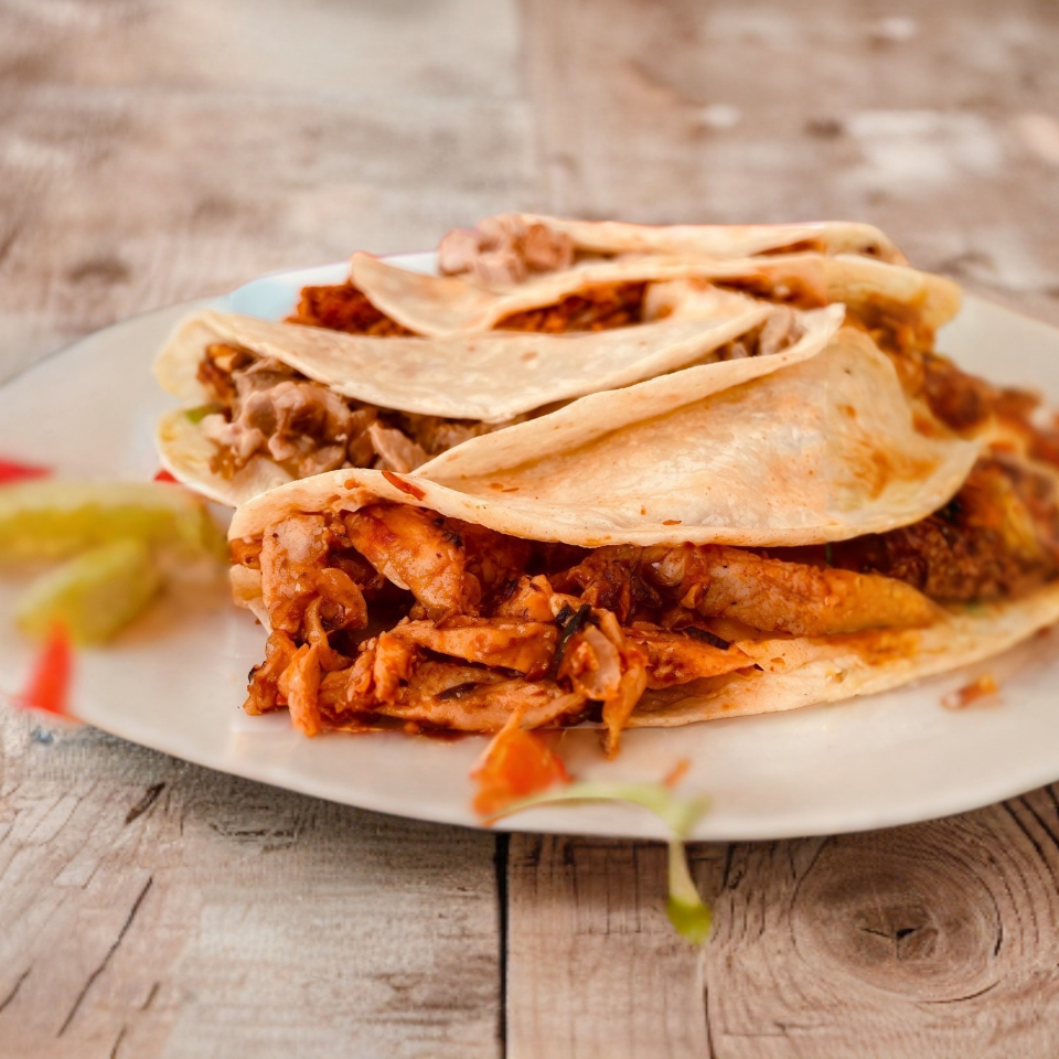 1 Quesadilla al Pastor: tortilla rellena de carne al pastor y queso Oaxaca, acompañada de salsa roja y salsa verde por aparte.