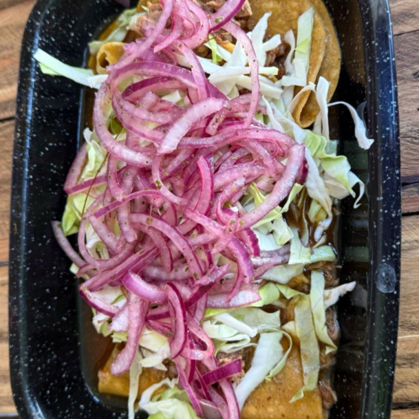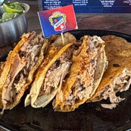 Tacos dorados bañados en salsa picante (4pzs de tacos y 10gr de barbacoa)