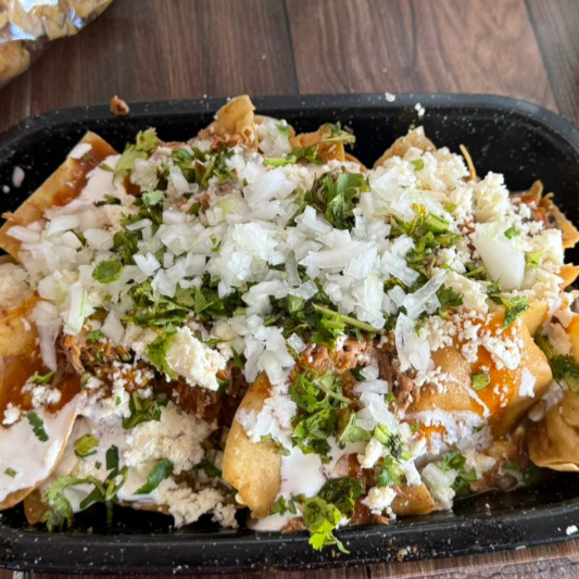Crijientes bañados en salsa y coronados con barbacoa (Totopos, 70gr barbacoa)