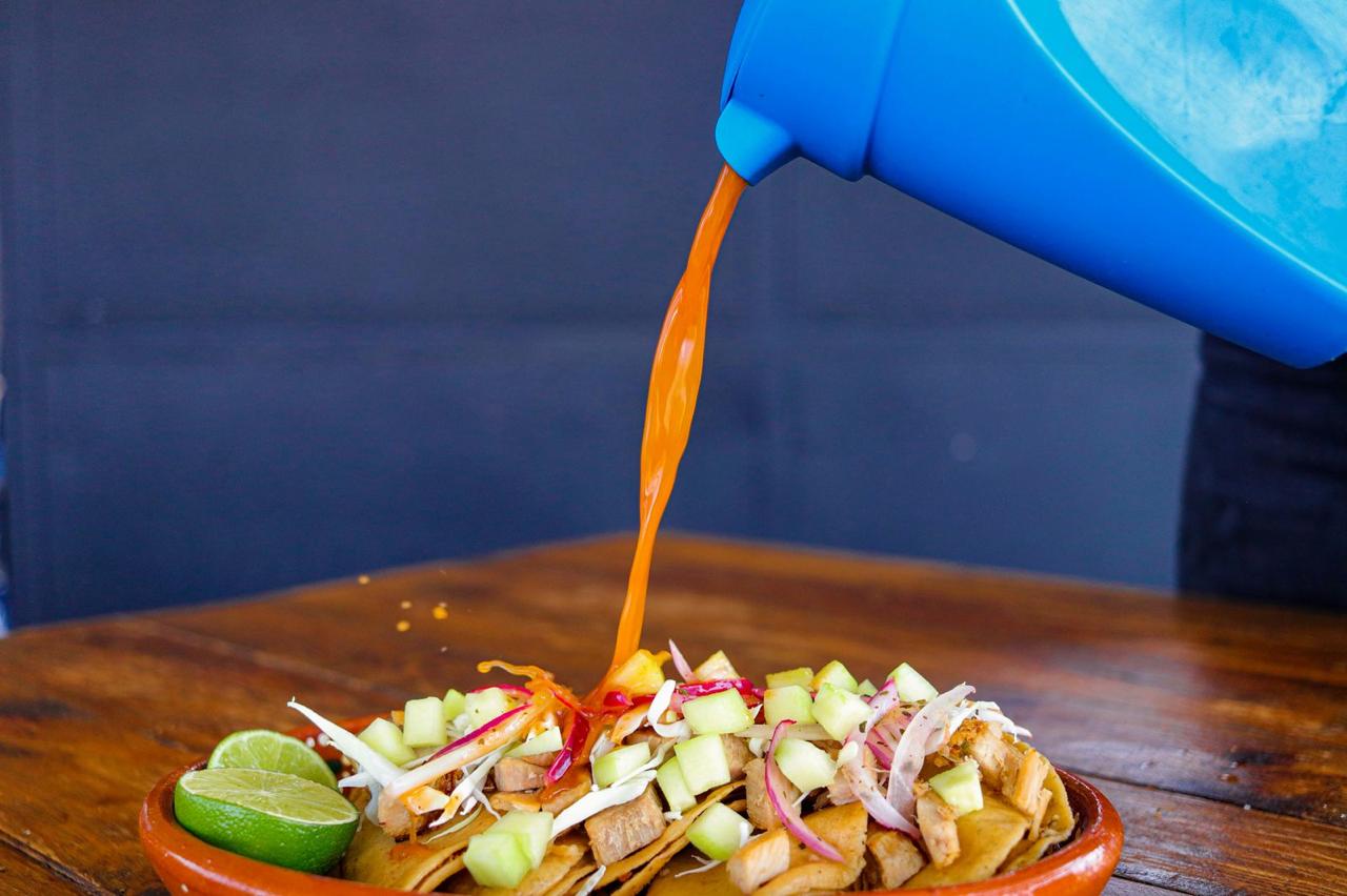 Botana de chips con salsas especiales.