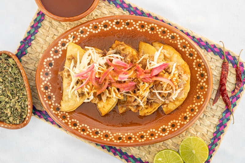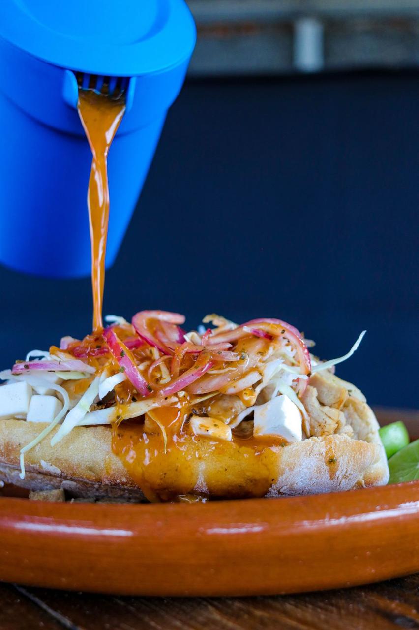 Torta tradicional bañada en salsa, rellena de carnitas.