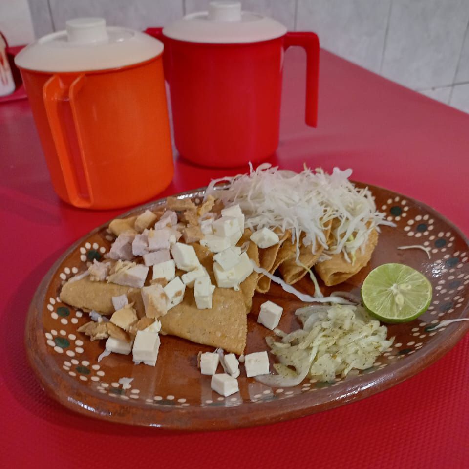 Taco dorado de papa con panela encima acompañado de cebolla desflemada y col con nuestra deliciosa salsa estilo jalisco