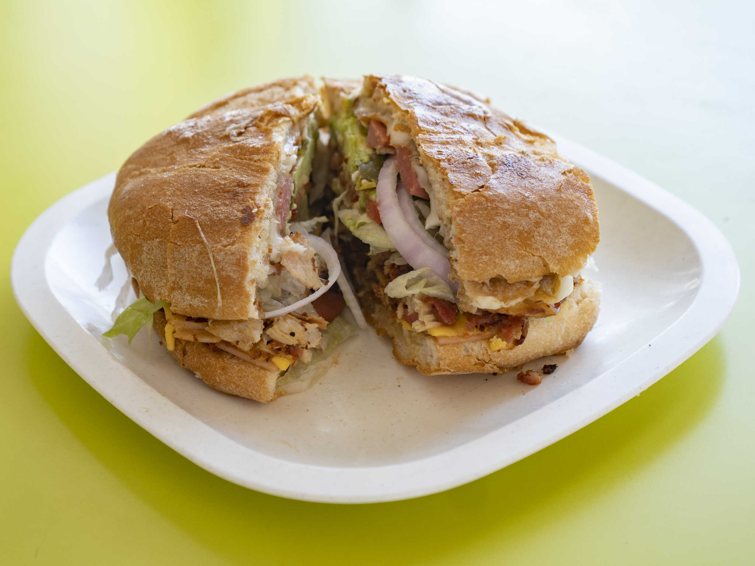 Pollo, tocino, lechuga, jitomate, queso panela y champiñones.