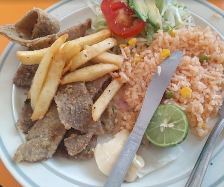 Carne de cerdo con frijoles y arroz.