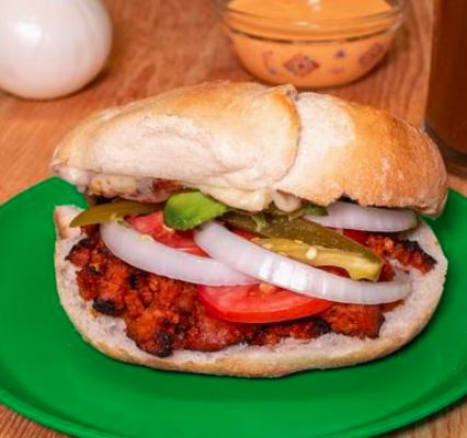 Milanesa de pollo. Todas las tortas van preparadas con crema, Jitomate, cebolla, aguacate y chile en vinagre.