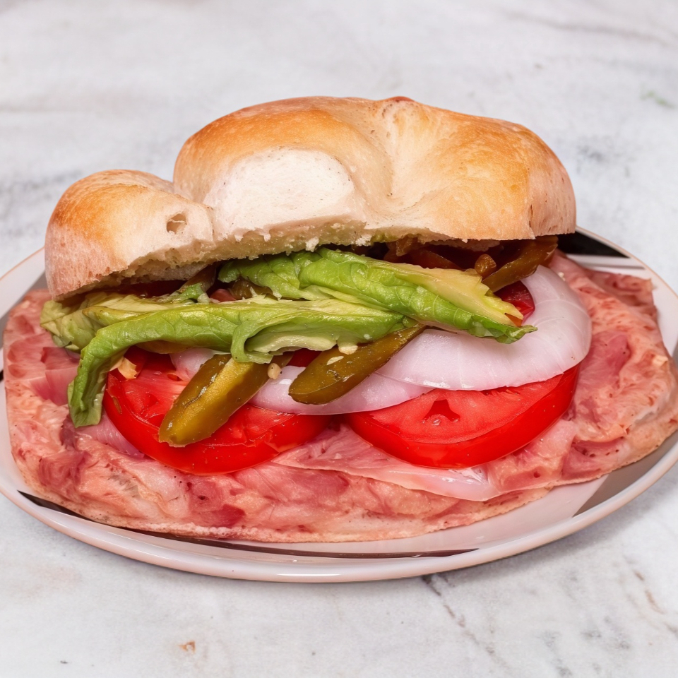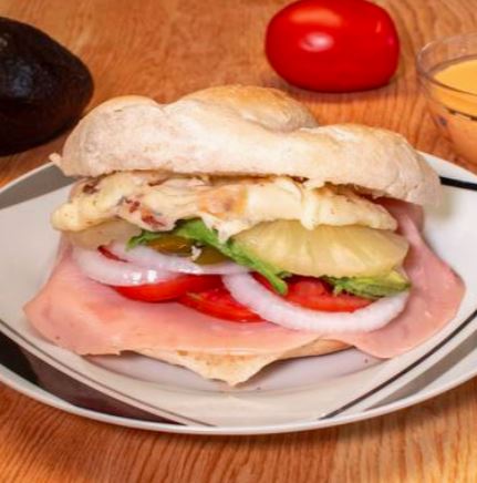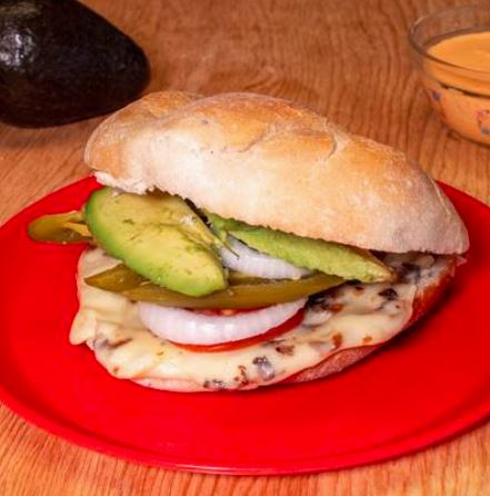Torta de queso asadero con crema, jitomate, cebolla, aguacate y chile en vinagre.