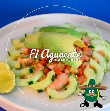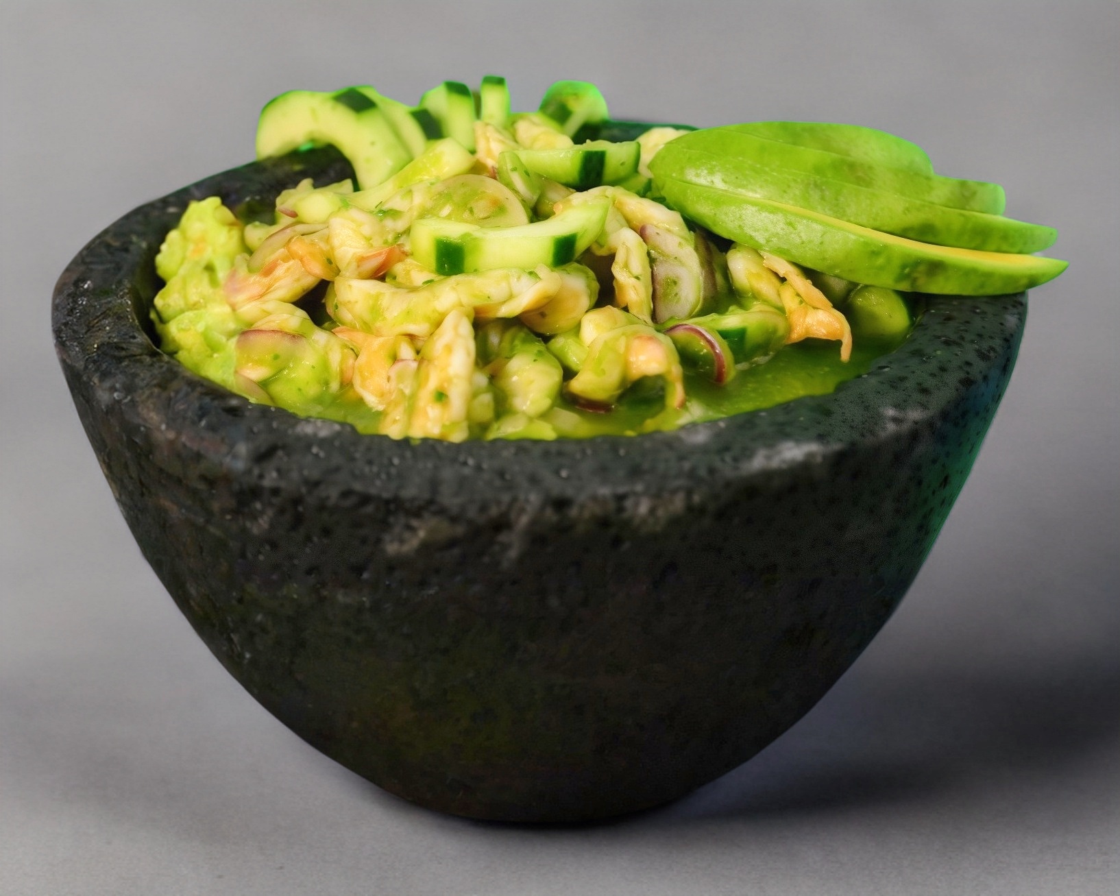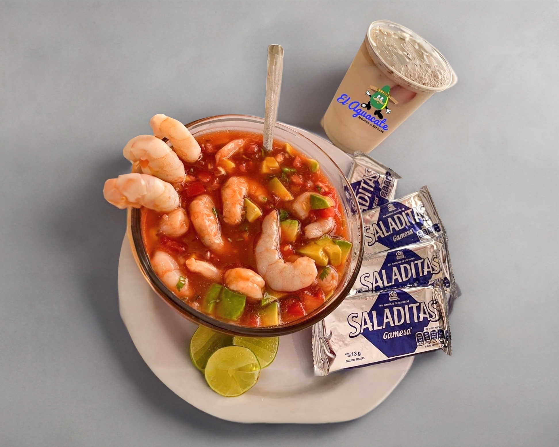 Camarón, cebolla morada, pepino, salsa verde, cilantro, serrano y aguacate.