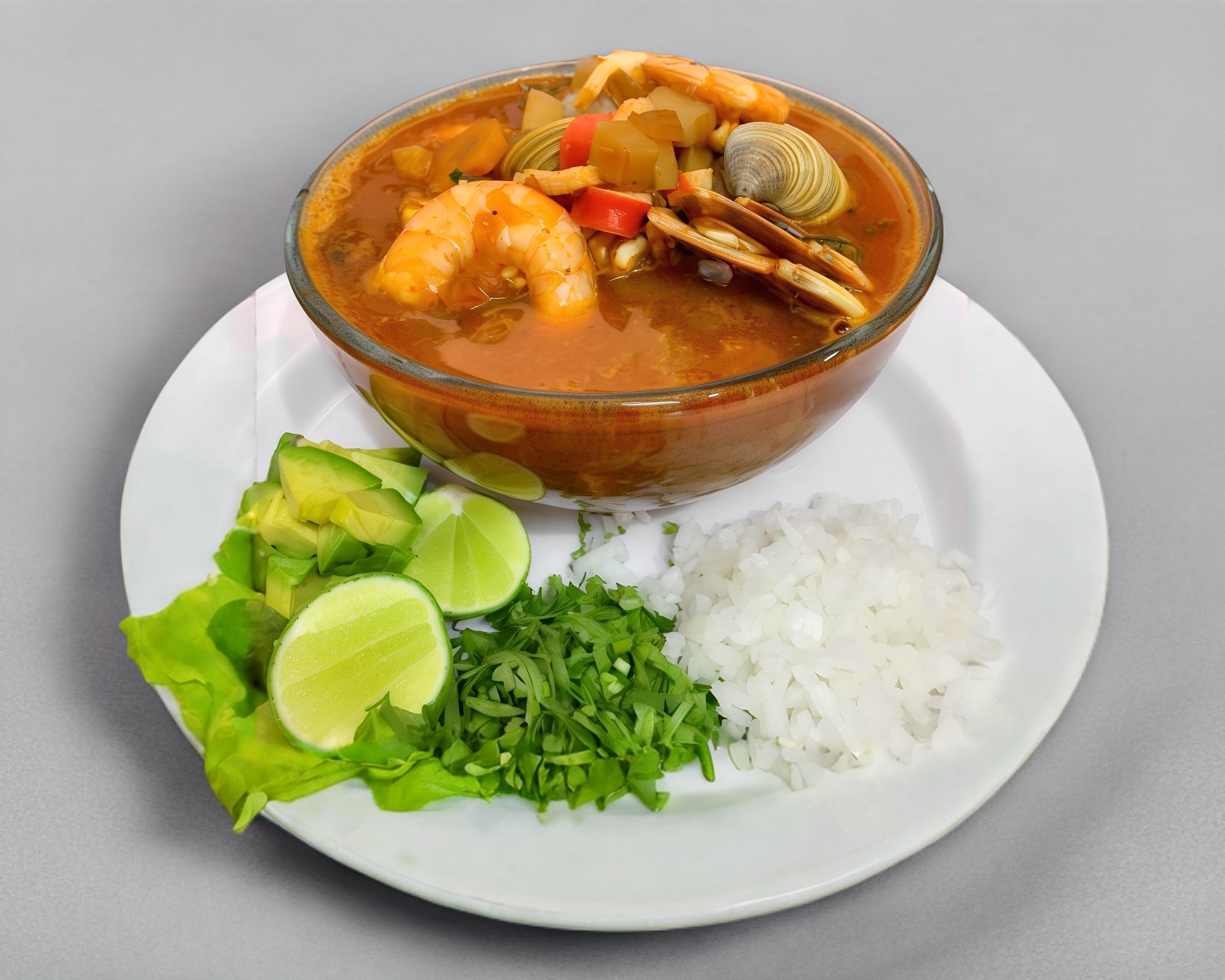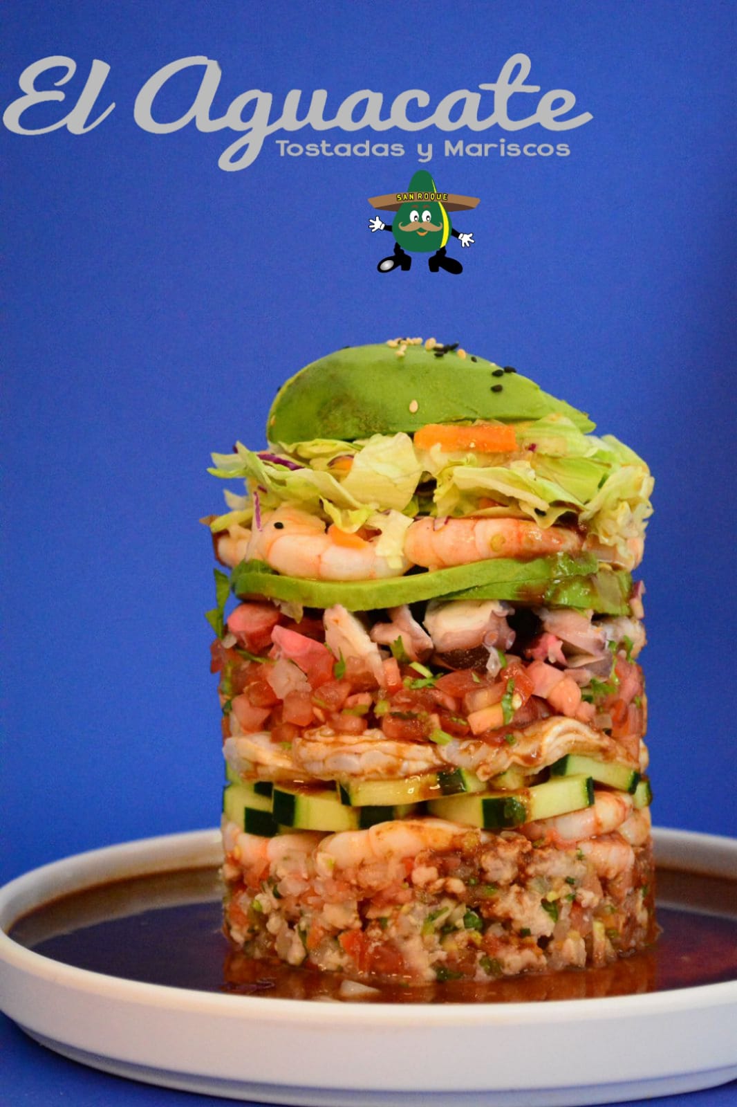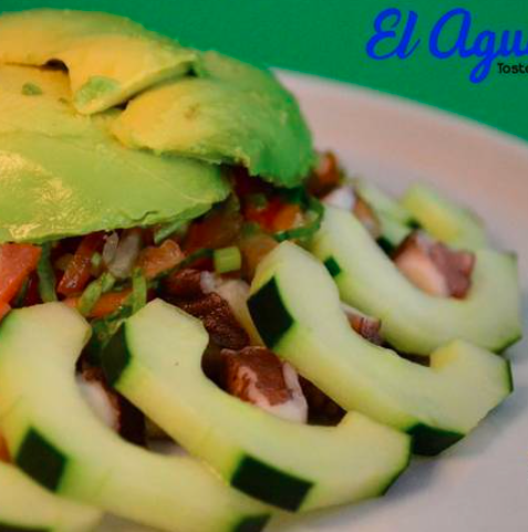 Camarón crudo, pepino, pulpo, mexicana (jitomate, cebolla, cilantro), camarón limpio, aguacate, ceviche, lechuga y salsa de la casa.