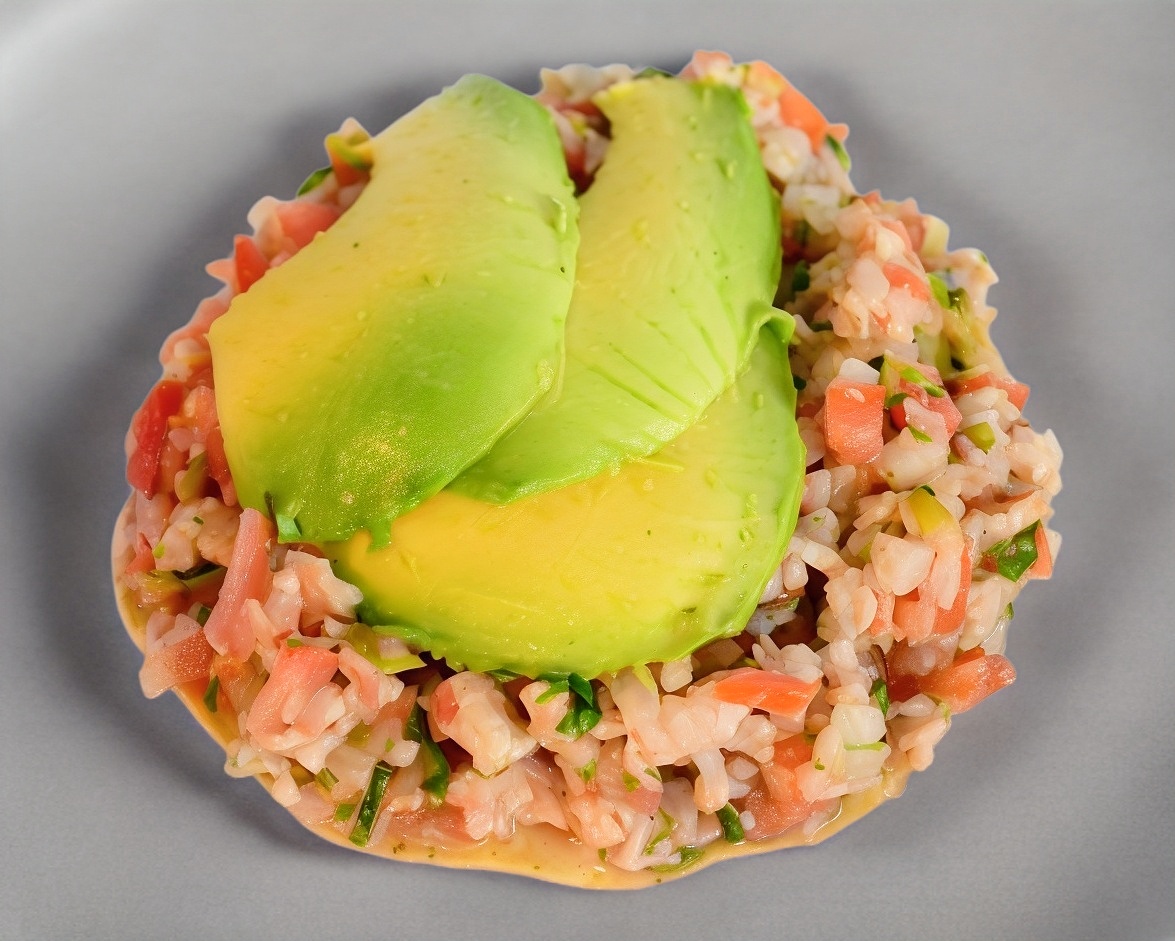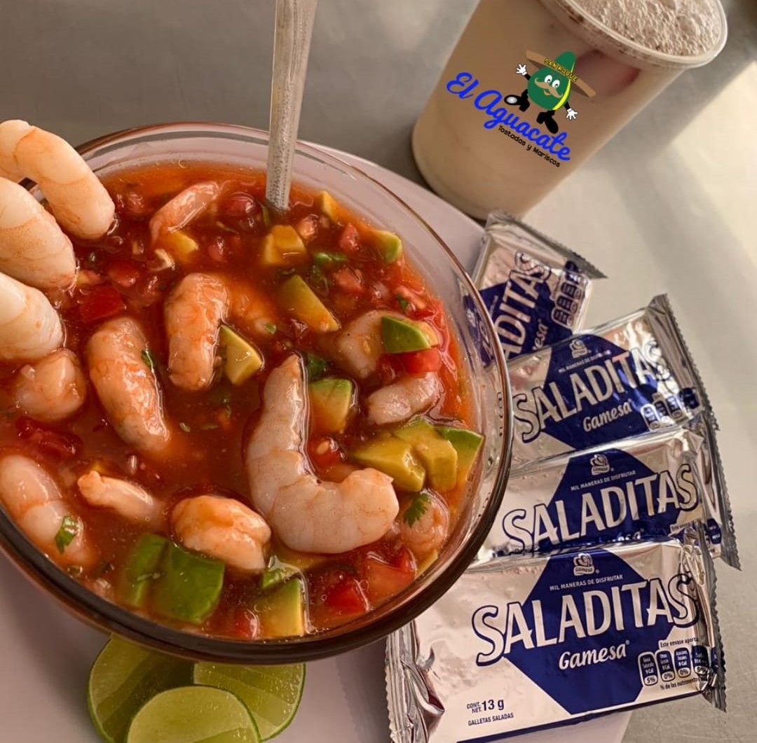 Camarón crudo, cebolla morada, pepino, salsa mango habanero y aguacate.