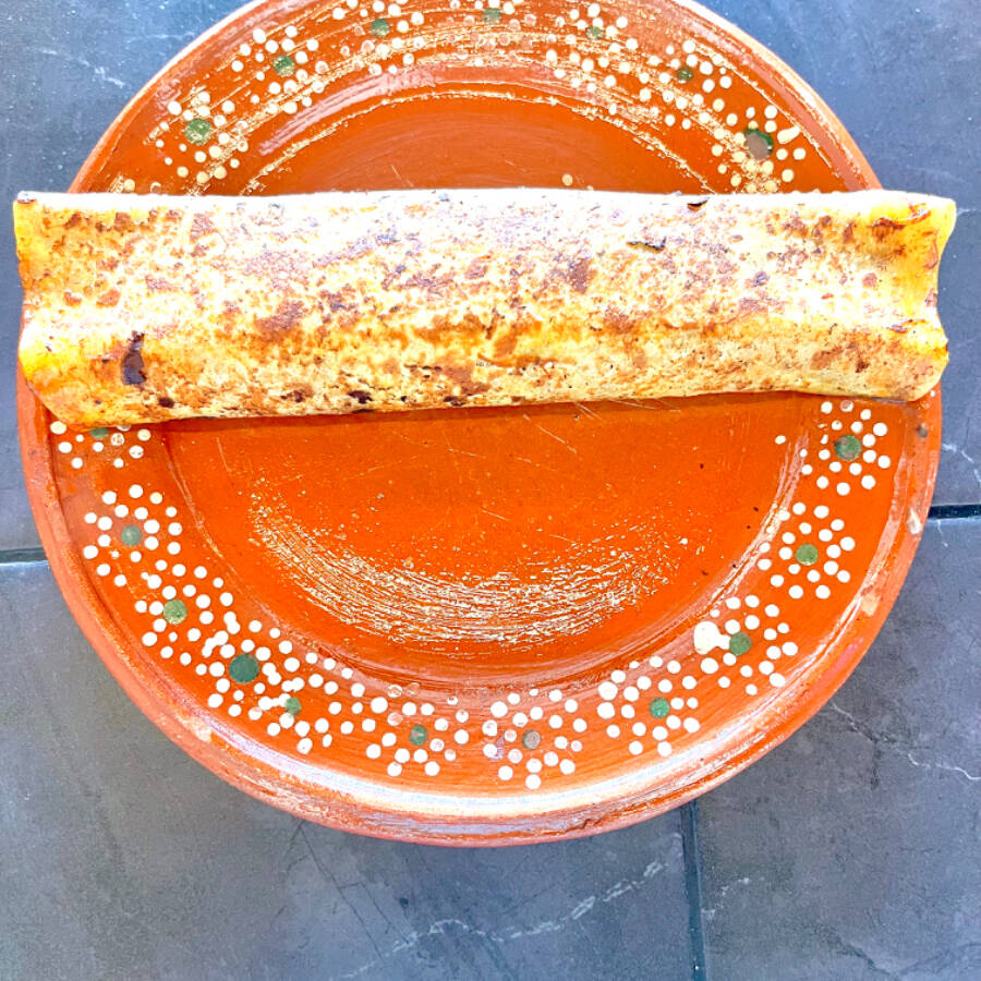Un burrito con frijoles negros relleno con cochinita Pibil, por fuera bañado en su jugo